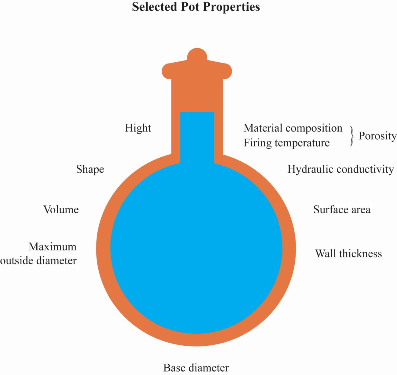 For the successful planning and application of clay pot irrigation, it is important to know the key properties of the pots, the soil, the plants and the environment. The most relevant pot properties include height, shape, volume, maximum outside diameter, wall thickness, surface area, hydraulic- conductivity, base diameter, material composition, and firing temperature, of which the latter two determine porosity (See Figure 3). Relevant soil properties include its hydraulic conductivity and salinity (See Figure 4). Among the key properties of the plants are their root properties and water demand (See Figure 5). Concerning the environment, key factors include local climate and weather conditions as well as other plants nearby.