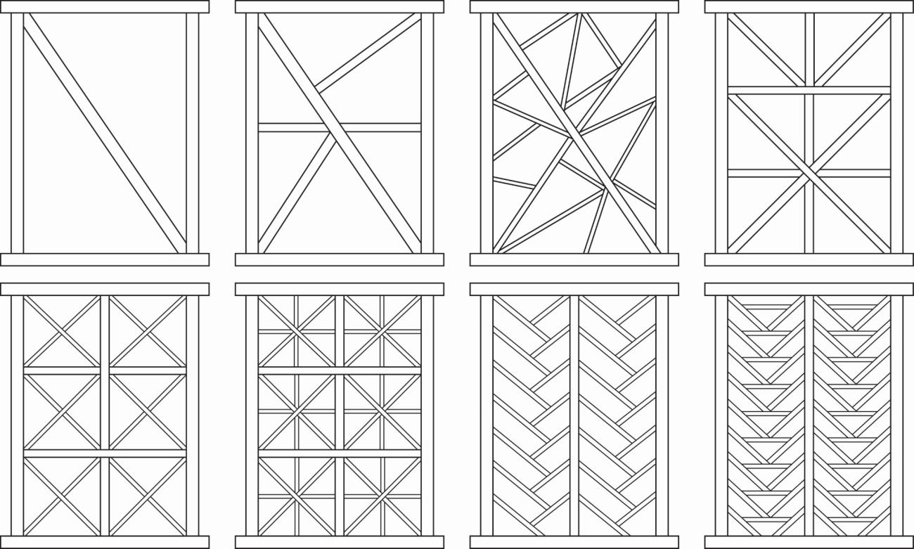 "The primary structural elements are generally thinner than those of their European cousins (colombage, Fachwerk). The secondary sub-divisions are made of board-sized short pieces nailed to the primary elements. The subdivision patterns can vary from stiff cross-bracings to ever more ductile zig-zag, chevron, fishtail or random assemblies." 9