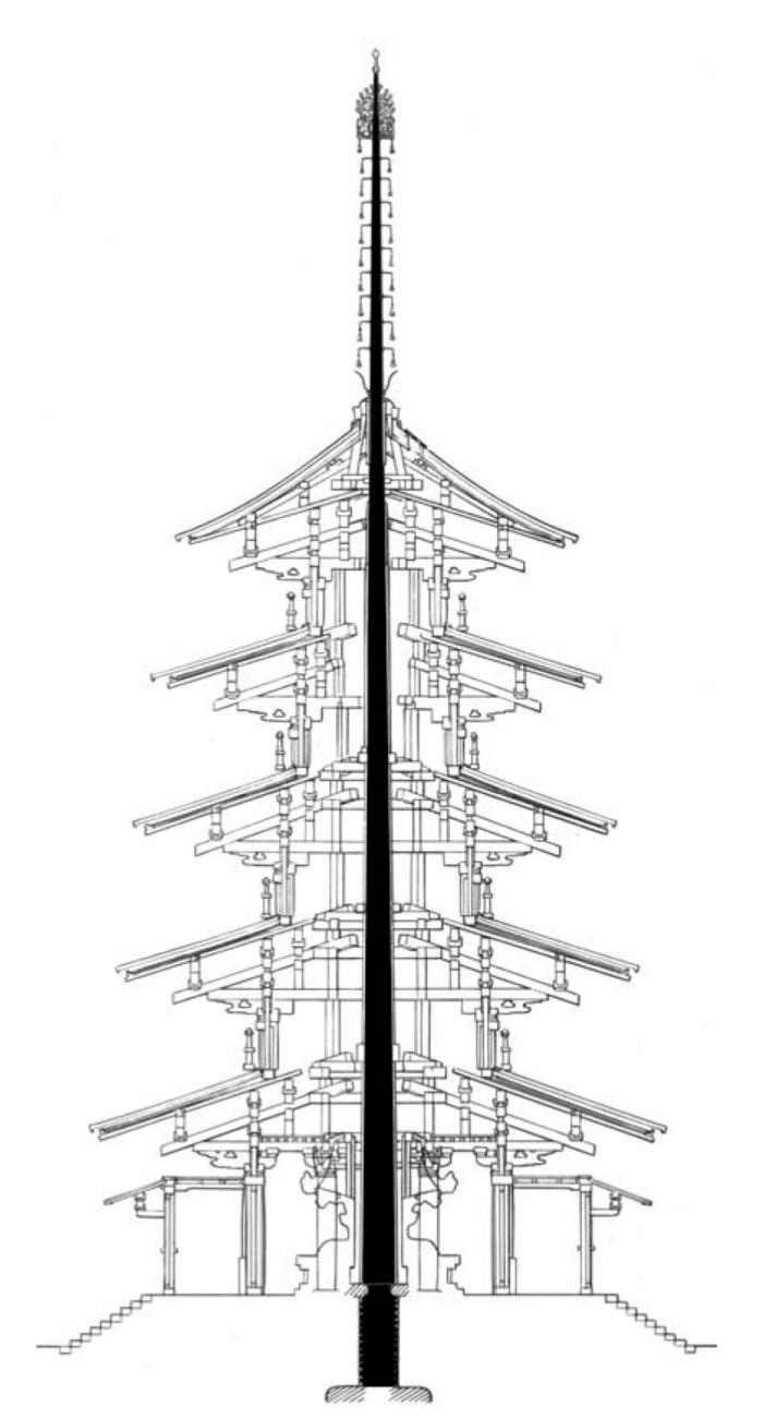 The "Shinbashira" is the central pillar in ancient multi-storey timber pagodas. While the details of its construction changed over time, the pillar rests in general on a base stone, is not interlocked with the wooden frame of each floor and does not support the vertical load of the structure (See Figure 7). The earliest archaeological evidence of a shinbashira is preserved in one of the oldest wooden buildings in the world: The 122-foot tall pagoda at the HĆryĆ«ji (HĆryĆ« Temple) in Japan, which was built in the late 7th century AD.10 It was added to the UNESCO World Heritage List in 1993.11
