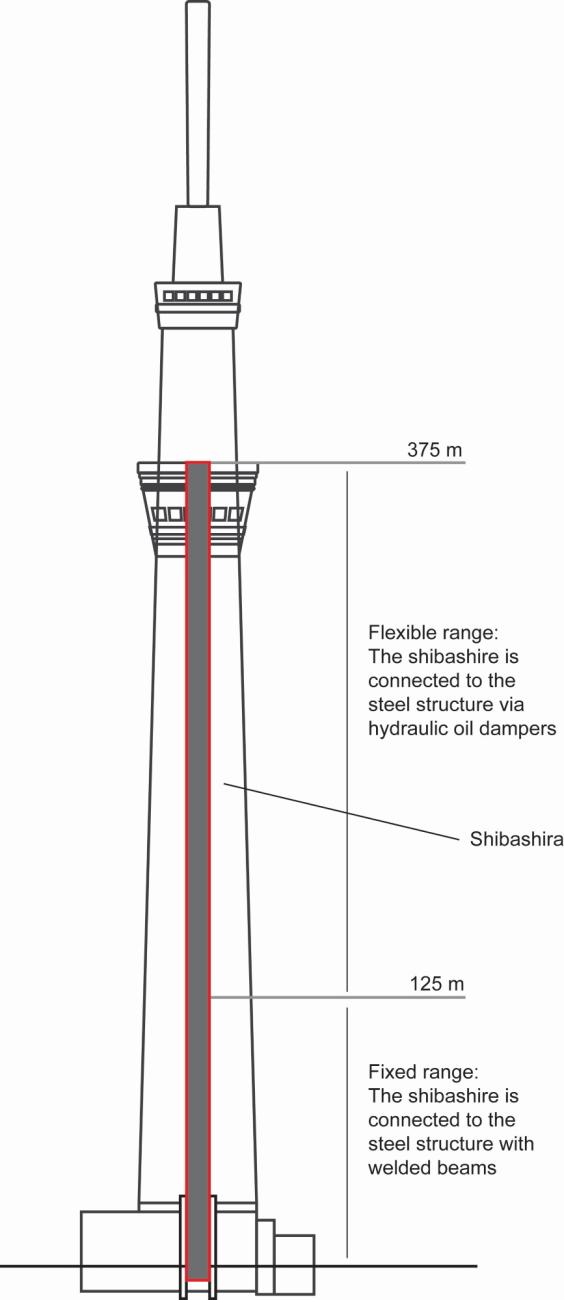 "One of the reasons why Tokyo Sky Tree withstood the enormous quake was the vibration suppression system, used for the first time ever, known as Shinbashira-seishin (Center Column Vibration Control). The core section of the main structure of Tokyo Sky Tree is a void measuring 10 meters in diameter, which extends up to a height of about 475 meters. A cylindrical column made of reinforced concrete measuring 8 meters in diameter and 375 meters in height, called the shinbashira (...) has been installed through the void as if piercing Tokyo Sky Tree. Even though the shinbashira is structurally separated from the main tower structure, the two are joined by steel beams up to a height of 125 meters, and via devices called dampers that suppress vibrations by stretching and contracting in the sections above.