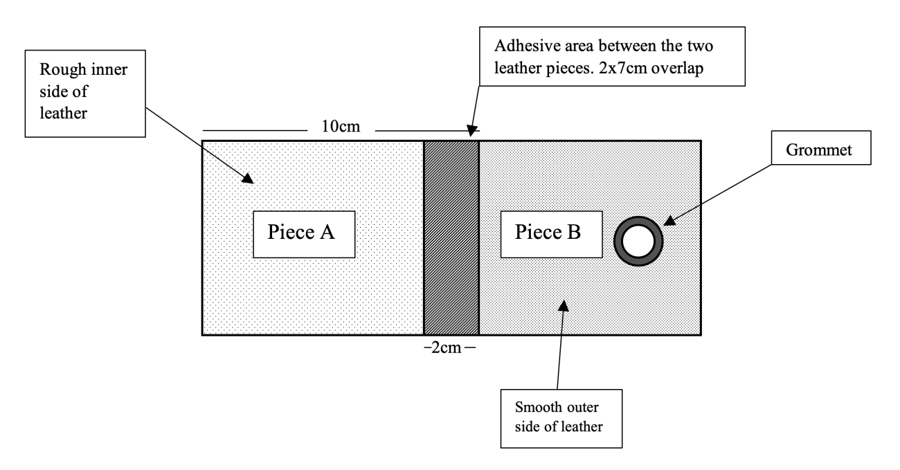 Figure 1 shows how the samples were prepared prior to loading. Commercial goat leather from offcuts was used, which, whilst not being directly comparable to hides which Neanderthals may have used, provided a uniform set of fabric samples in sufficient quantity for this pilot study. The limitations presented by the use of these modern commercial offcuts meant that tests were restricted to only exploring leather sides which did not include hair. The presence of hair within the bonded area may affect the strength of the bond, an idea which should be explored in future work. The use of a metal grommet, whilst again a contemporary element, prevents the leather samples from ripping and helps to generate a controlled, even loading on the seam that is consistent across experiments.