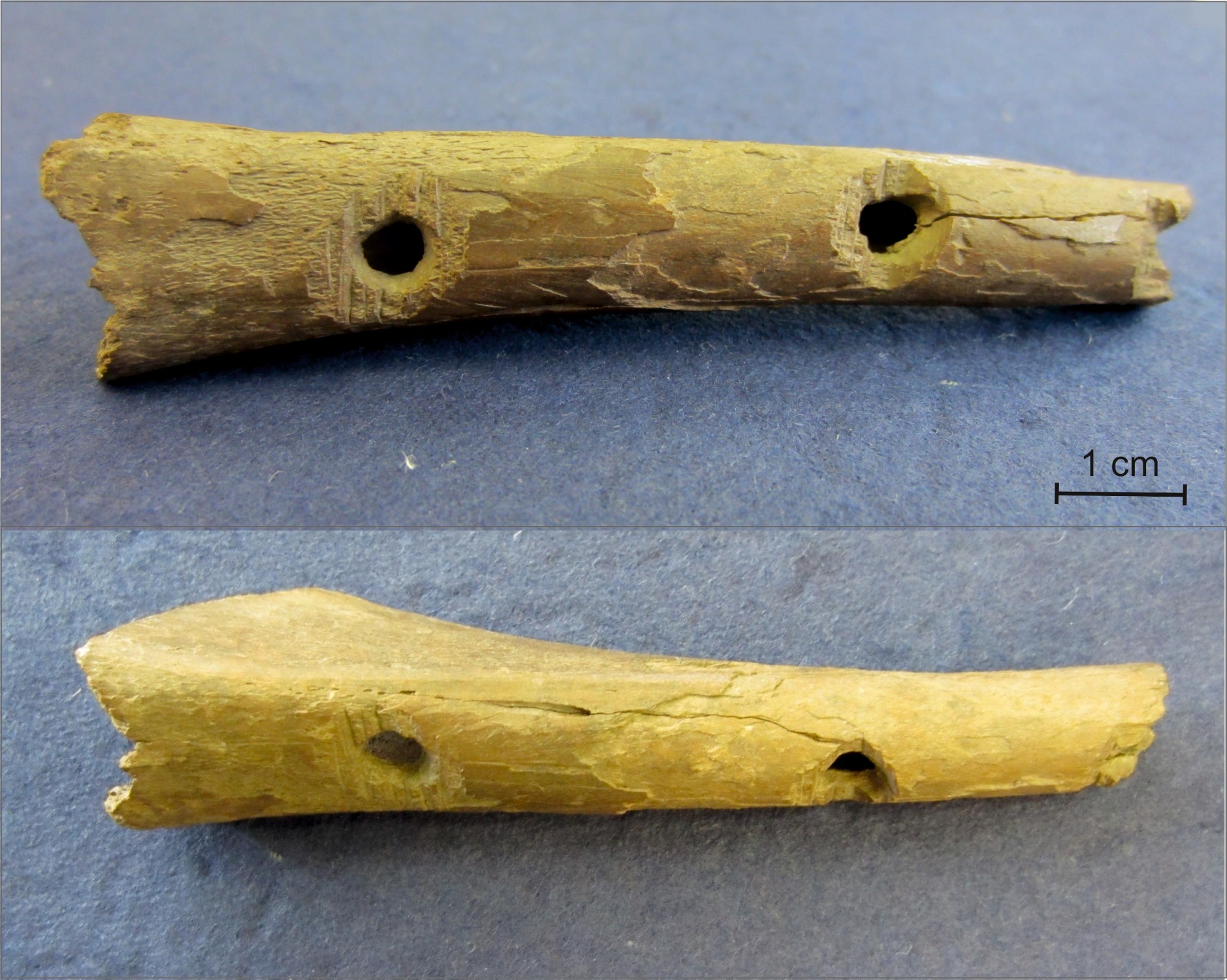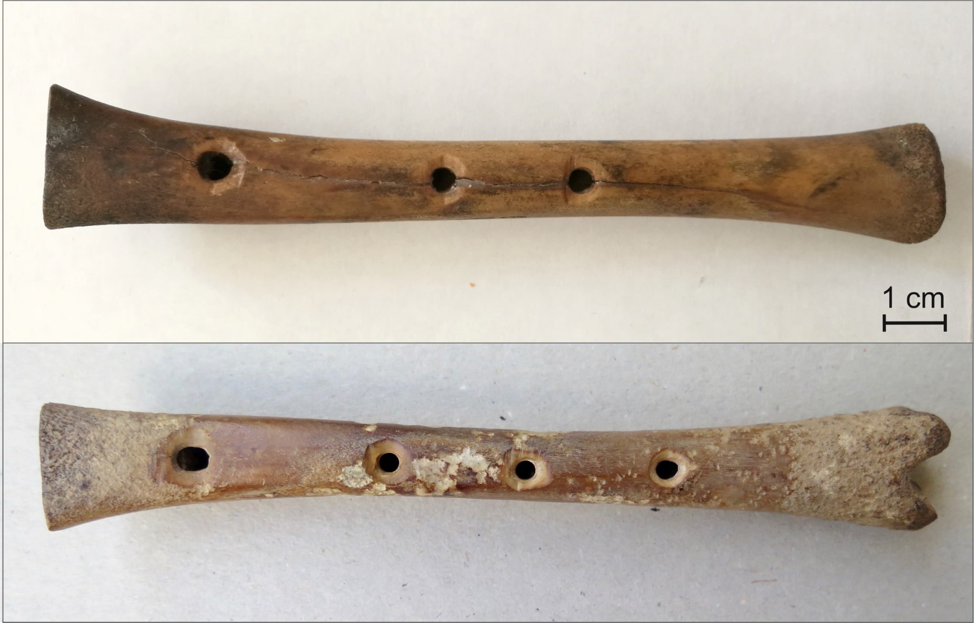 The flat backside of the Mätäjärvi tibia has been turned into the front side of the flute by adding holes. Two human-made holes are clearly visible (See Figure 6); of a third hole, only the top rim is left. As the lower part of the tube is lacking, we do not know whether the artefact was originally provided with a fourth hole. The diameter of the more or less round holes is 4 x 4 and 4 x 3.5 mm. Transverse scratches around the two holes and the deep cut at the damaged hole make clear how the maker proceeded in perforating. At first, the maker thinned the places of the intended holes by cutting, or rather chopping them with a knife. This makes it easier to drill a hole through the thick wall of the bone. Furthermore, the resulting concave surfaces make it easier for the fingers to find and close off the holes when playing. This is a feature found in several medieval bone flutes (Leaf, 2008). Drilling of the holes in the Mätäjärvi tibia was probably executed by scraping with a knife and by turning the point of the knife round and round. This can be deduced from the fact that the holes are not quite as circular as when executed by a drill. The ridges around the holes were not finished off. Perhaps the strategy was to scrape off all cutting traces in the end if the instrument appeared to play satisfactorily. Was the maker of the Mätäjärvi flute dissatisfied with the result, leaving the rims of the holes unfinished or discarding the artefact after it broke? Or was the maker just sloppy? All in all, this flute is rough-hewn and coarsely made compared to other bone flutes of the same type, excavated in Great Britain, the Netherlands, or elsewhere in Central Europe (See Figure 7).