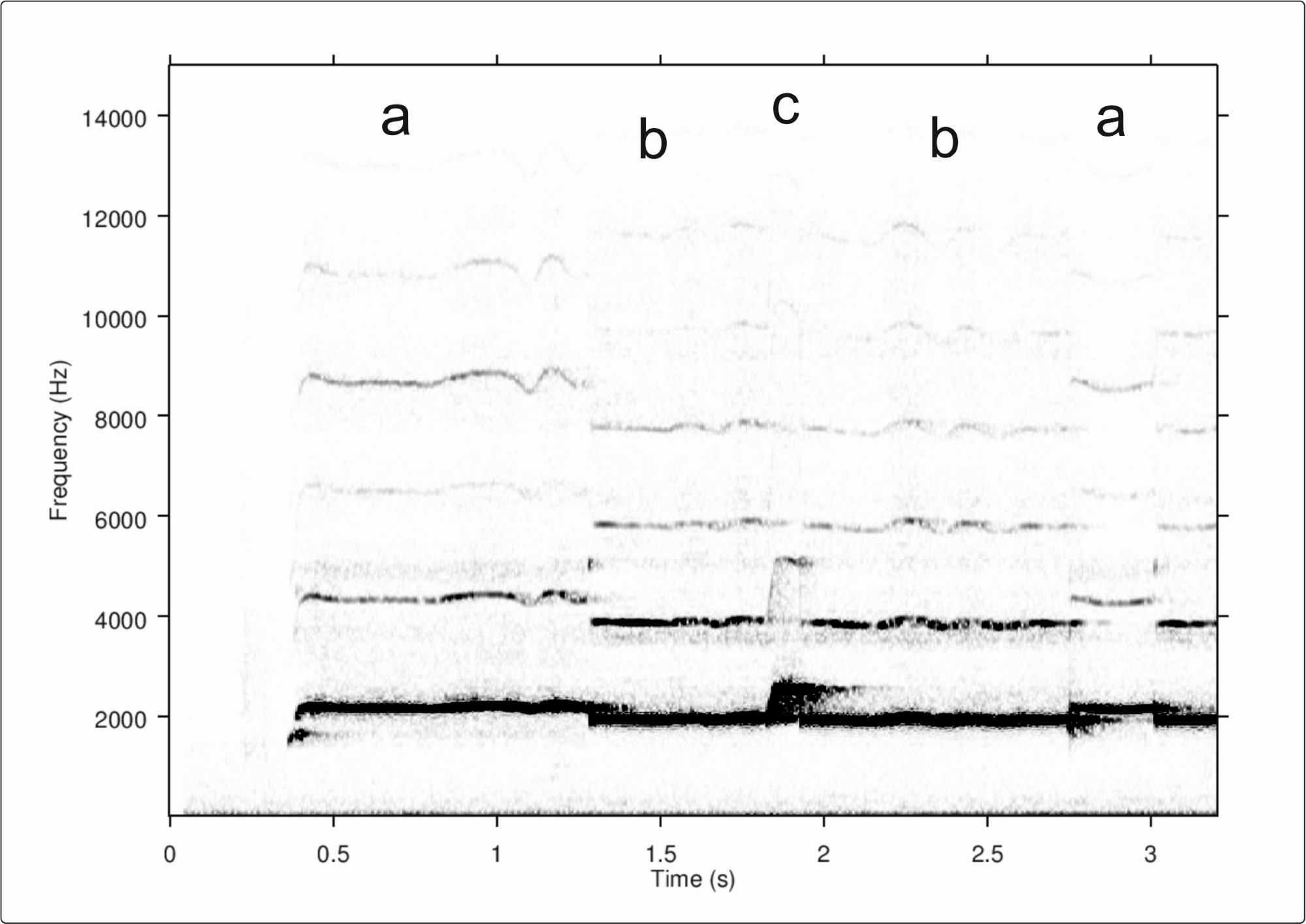 By covering and opening the three finger holes of the flute, it is possible to produce three or four different tones or pitches. In principle, the more finger holes are closed (as seen from above), the lower the tone becomes. Surprisingly, the covering of the lowest hole in this flute raises the pitch, which suggests that there might be some kind of block in the lower part of the tube, preventing the air from running freely through the tube. However, this feature, or defect, did not necessarily show in the original flute because it involves the missing and hypothetically reconstructed part of the fragmentary find. As expected in a flute of this length, the frequencies of the playable tones or pitches are quite high. The fundamental of the first sounds at 1910–1945 Hz, the second at 2150–2222 Hz, the third at 2369 Hz and the fourth at 2460–2650 Hz (See Figure 12). These frequencies correspond to the notes A#6+42–B6-27, C7+47–C#7+4, D7+14 and D#7-20–E7+9 in the Western musical tuning system. As adding the air pressure raises the pitch of the flute effectively, the given values are only estimates, open to modification. According to spectrum analysis, each of the playable tones has five to seven relatively strong overtones that add clarity and brightness to the sound. The sound of the air cannot be heard that much, probably because the tube is too narrow to allow the air to hiss. Overblowing is not successful.
