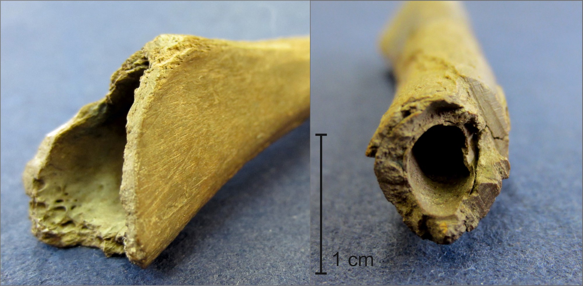 In its present state, the Mätäjärvi sheep tibia is 89 mm long. Though bone flutes about that short do occur (e.g., Tamboer, 2004; see Figures 1–5a), this was obviously not the intended length of this artefact because the lower narrow end is clearly broken off. The lower end is broken across a human-made hole next to a deep, transverse cut (See Figure 5a). To the eye, the bone here seems to be much thicker compared to the upper wider end of the bone, but the difference is negligible: 2.5 mm at the break, 2 mm at the top end. In the upper wider end, a small part of the front side is broken away. The wall of a tibia bone is thinner here and has a spongy inside structure that is more vulnerable and prone to damage than the more massive parts. The gently curved, slanting rims of the beak are not broken off but have been cut with a knife (See Figure 5b).