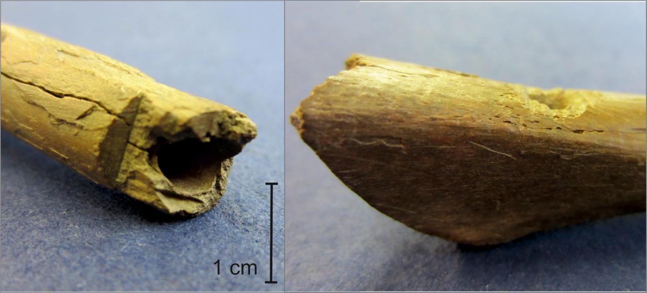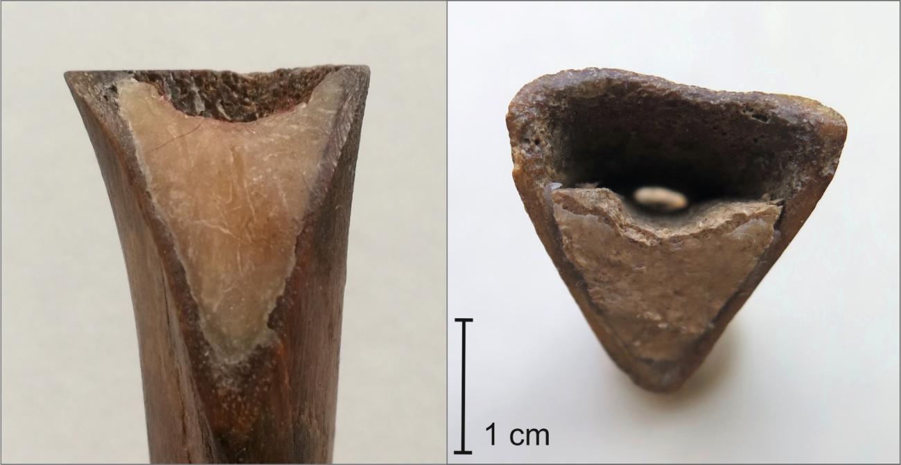In duct flutes, the windway directing the airflow against the rim of the soundhole – the window – is usually shaped by inserting a separate block to the blowing end. However, duct flutes in which the player’s tongue acts as a block are known too (Emsheimer, 1981; Lund, 1981). In these so-called tongue duct flutes, the window is placed fairly close to the end of the bone because the player’s tongue tip acting as a block has a limited length. The wall on the opposite side of the window is usually removed to give way to the lower lip of the player. This is not the case in the Mätäjärvi flute. In this artefact, the distance between the window and the blowing end is too large to enable the playing as a tongue or lip duct flute. That is why the interpretation as a block-and-duct flute is more plausible in our conclusions. A block can be cut from wood, as is the case in medieval and later wooden recorders. Some wooden blocks and even an example of a bone block have been found inside medieval bone flutes, but these finds are rare (See Figure 7; Lund, 1985, pp.14–15).