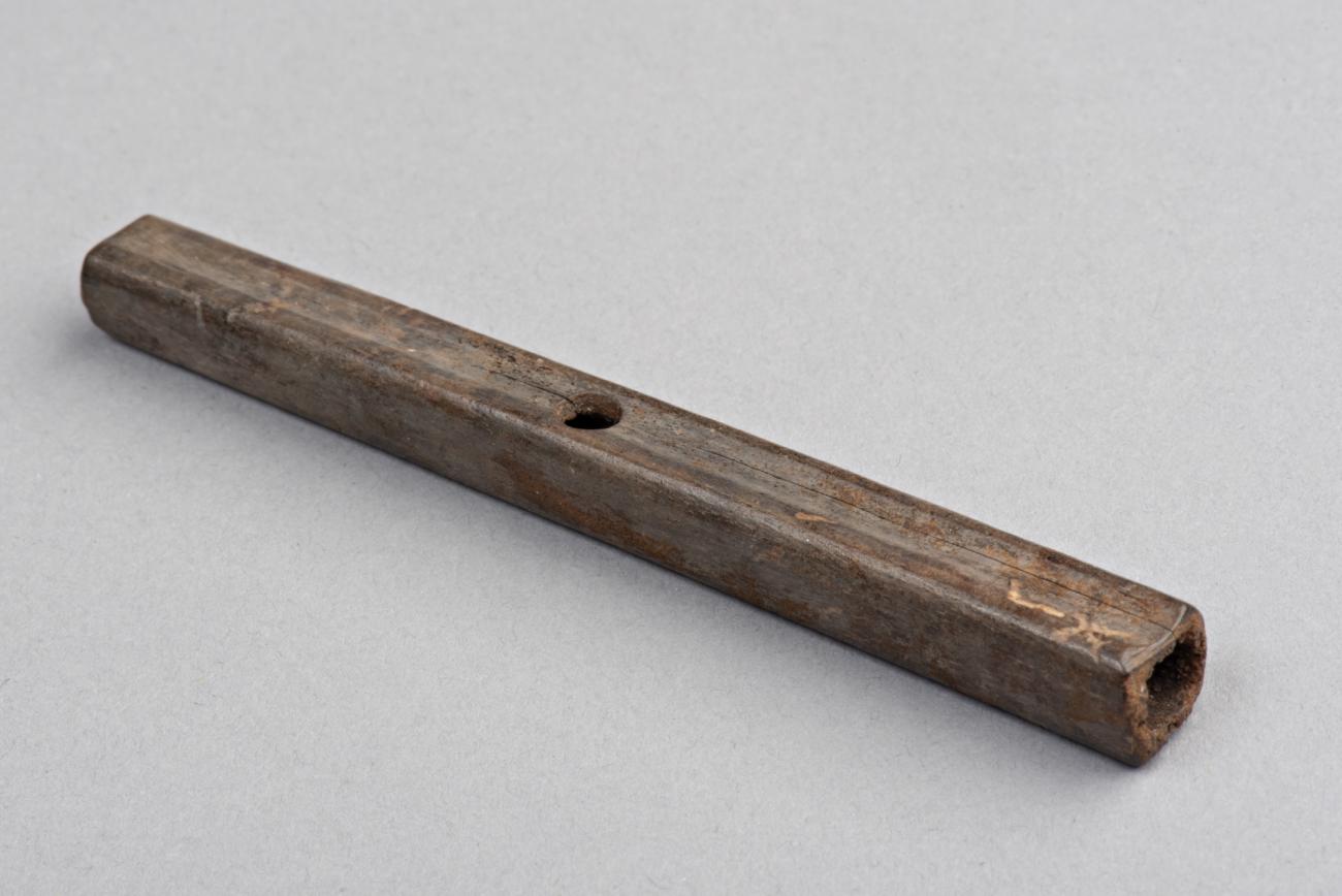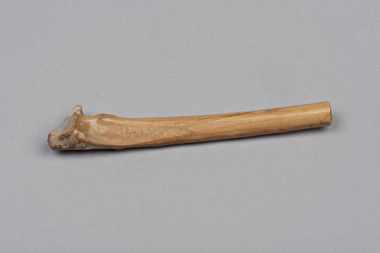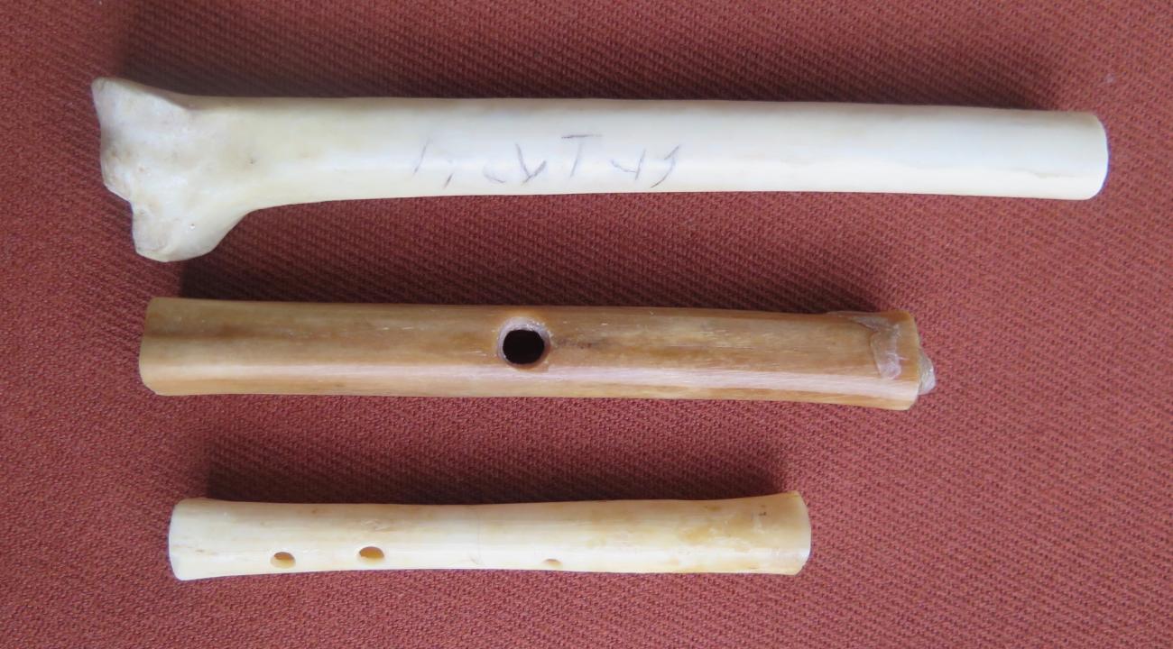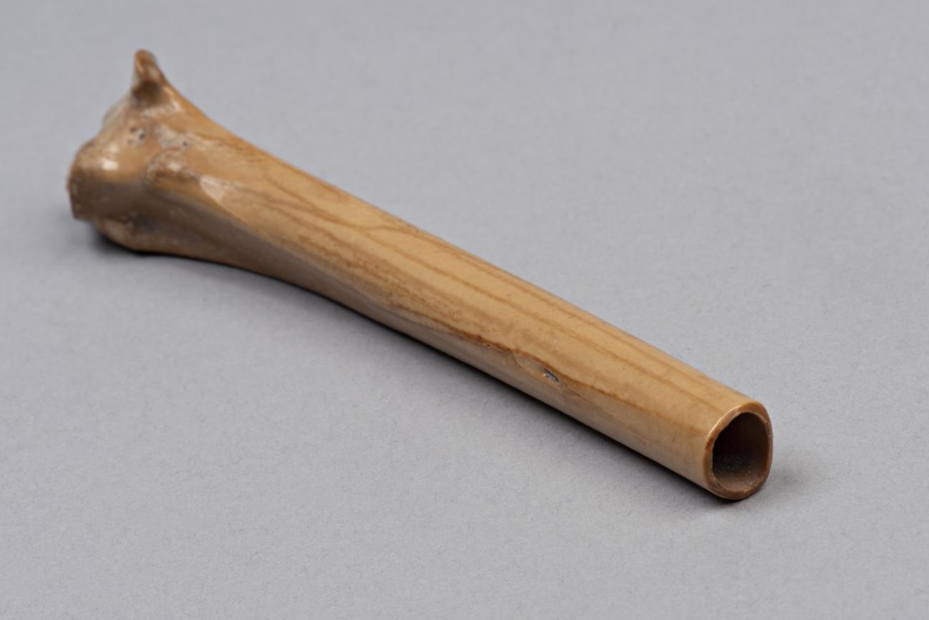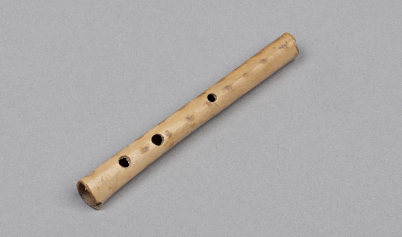 A stork wing bone with three holes drilled in a row, interpreted as a reed call
