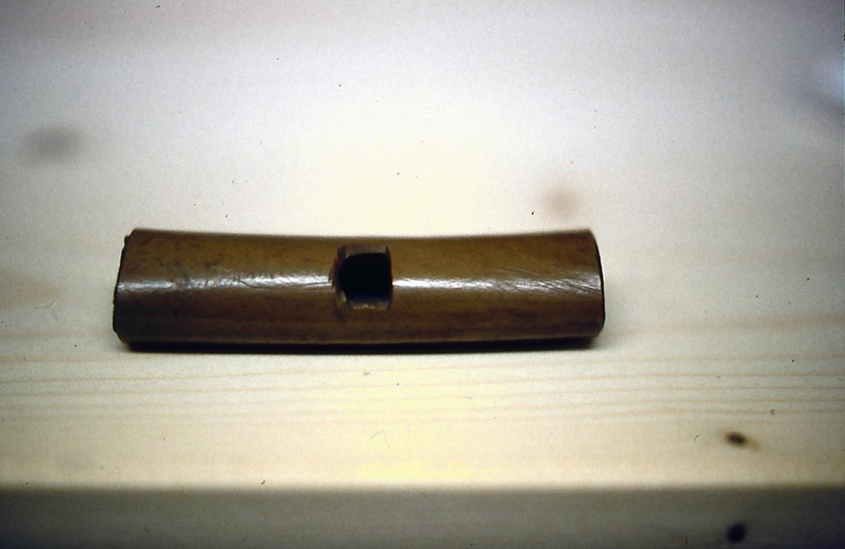 In Velsen, a roe deer metatarsal carefully made into a rectangular tube with a hole was found (Bosman, 1997, p.50) (See Figures 9 and 10). The joints from both ends were removed, the bone was scraped into a more quadratic shape than it was originally, and a hole was made in the thick wall of the bone, using a drill, as witnessed by the perpendicular sharp edges. The hole, with a diameter of 5 mm, was put more or less in the middle of one side: 4,5 cm. from one end, 4,1 cm. from the other end. Bone tubes with holes in the middle could be used as buttons, but these are not as long in proportion to the diameter. Another type of tube with a hole was a needle case with a metal suspension chain fastened in the hole. This would have caused abrasions of the sides of the hole which were not found in the Velsen bone. The tube is too short to be played as a transverse flute, moreover, the hole to be used as a mouthpiece has a rim that is very thick in relation to its diameter, and proved to produce at most a hissing sound. In some types of signalling whistles or animal calls, however, the window hole is placed in the middle. This kind of whistle goes back to the late Neolithic, e.g., one of the whistles excavated in Hemudu (China) that is interpreted as a deer call. This type of calls is still being used, like a type of otter pipe known from Norway (Lund, 1988, pp.299-302). Examples from the Roman period in the Netherlands are several signalling whistles found in Valkenburg (Tamboer, 1999, fig. 13). One of these was made from a wing bone (humerus) of a crane (Grus), length 7,6 cm., diameter 1,7 cm. (See Figure 11).