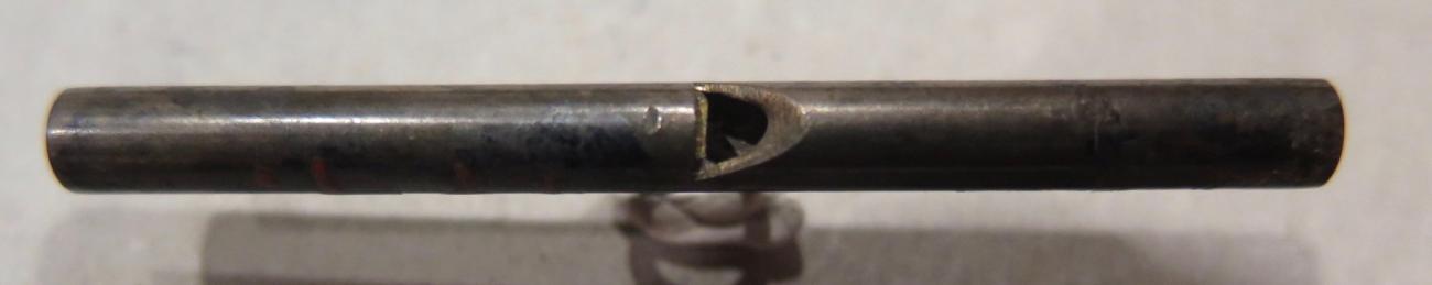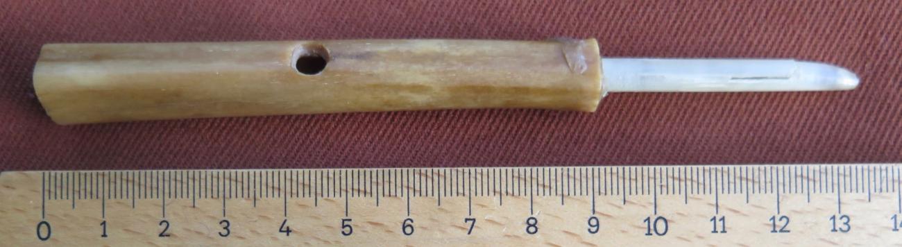 The window is cut into the stirrup shape common in excavated bone block-and-duct flutes and calls (Brade, 1975; Tamboer, 2004, fig.1-5). In order to sound the Valkenburg whistle, a small lump of wax must be placed beneath the window in order to deflect the air to the lip of the window. A narrow and long version is a modern metal hazel hen call (See Figure 12). This type of whistle was and is still used as a multi-purpose animal call for hazel hen, roe deer, as well as fox and other animals that catch birds: in this case, not the animal itself one wants to catch is imitated but its prey animal, the sound of which will lure the hunted animal (e.g., documented for Slovakia in Elschek, 1983, pp.125-126).