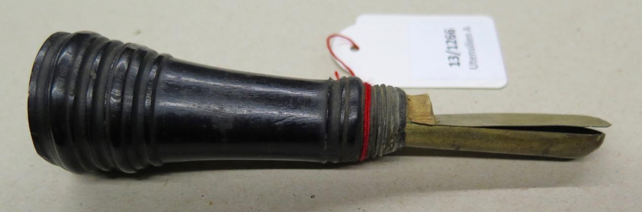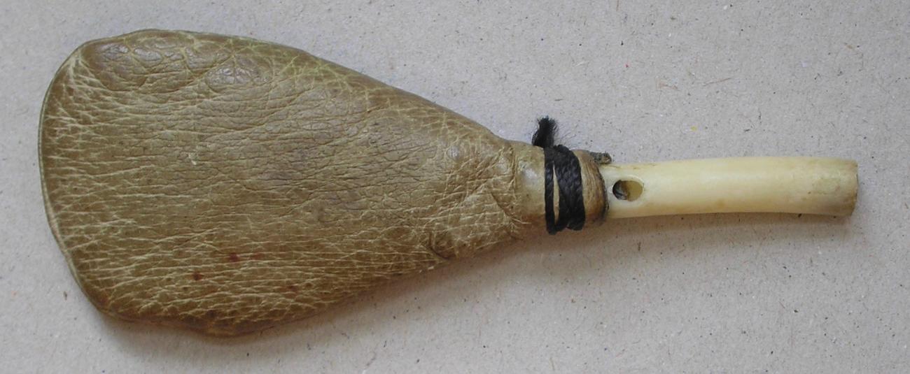 The Velsen roe deer metatarsal is about as slender as the metal hazel hen call of Figure 12. The window of the hazel hen call has a half-moon-shaped window with a lower rim that is oblique. This splits the air stream and produces the sound. Some types of calls do function even when the rim of the window is not thinned out, like the quail call of Figure 13 that is bellows-driven. By tapping the leather pouch filled with horsehair, a whisp of air produces rather soft plosive sounds resembling those of quails. However, the bone is considerably thinner than in the Velsen deer bone, and a lump of wax is inserted to deflect the air to the window rim and produce sound.