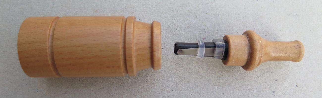 A variety of reed-driven animal calls are used for luring deer, all kinds of waterfowl (See Figure 7) and fox (See Figure 8). The sound of the Velsen reconstruction reminds us of roe deer calls. Hunters, in the past as well as nowadays, use a reed instrument to imitate the plaintive call of a young kit to lure roe deer into a shooting (or photographing) distance. Changes in tone color can assist in imitating the sound of the animal as closely as possible. Modern reed calls usually have a wind cap in order to protect the reed. No traces were left by an eventual wind cap as shown in the modern calls of Figures 7-8 are present on the Velsen find. Probably it did not have one, as it would not fit airtight on the flaring shape of the bone. The fact the reed was more vulnerable without a cap may not have been a large problem, as a new reed to replace the damaged one is easily cut in a length of feather shaft.