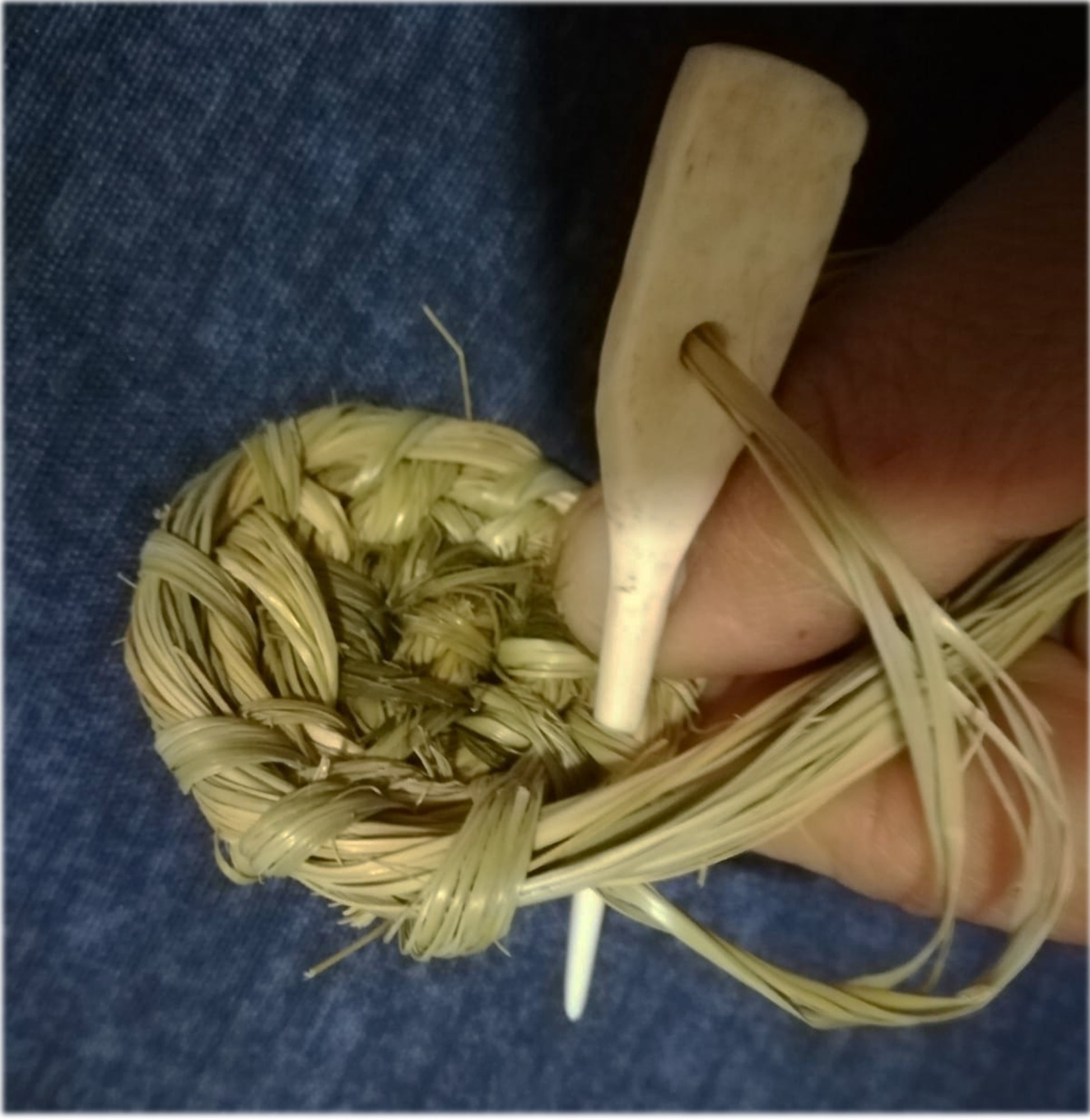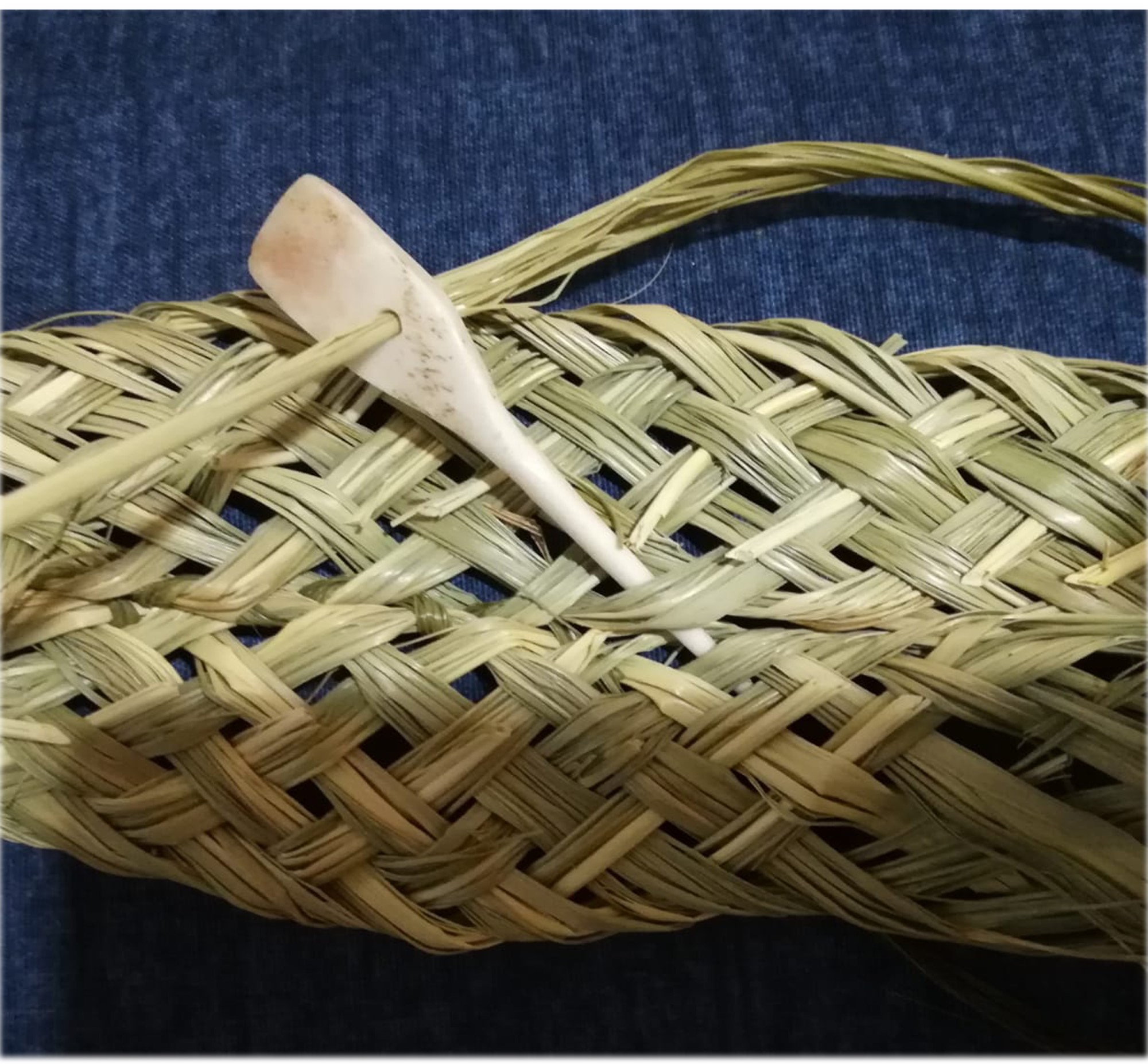 The second technique used to make baskets is the “sewed-braid coiling.” This technique consists of creating the braids with seven rows of Ampelodesmos and sewing these together using the needles. In this case, the craftsperson made braids with a very wide warp. Again, both needles proved to be suitable for this technique. In fact, the wide proximal part did not interfere at all with the successful completion of the work (See Figure 11a, b, c).