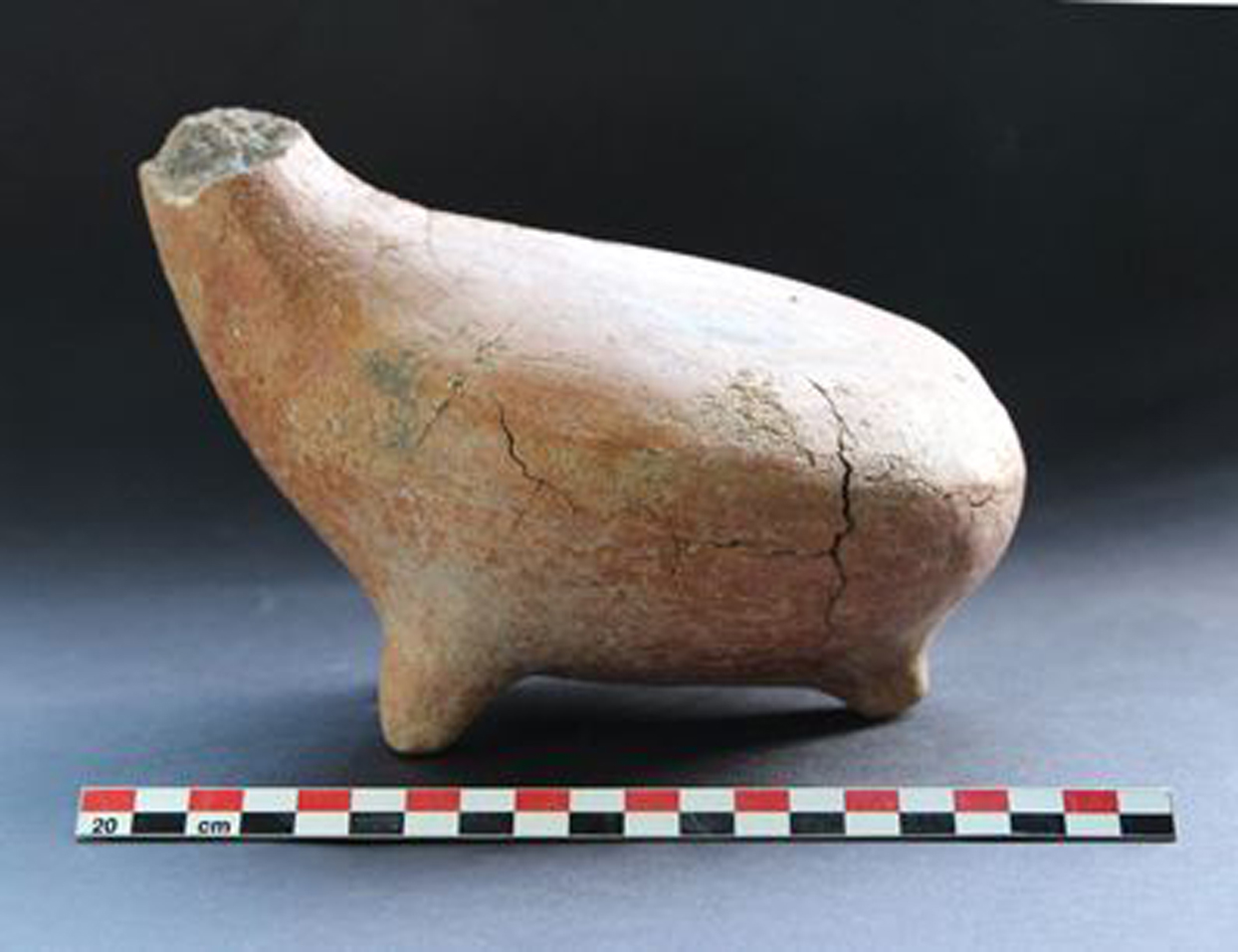 The Kura-Araxes occupation is characterised by wattle-and-daub round-shaped and rectilinear structures of mainly domestic character but includes a small building with a possibly cultic function (See Figure 2b), in which two zoomorphic ritual vessels have been found (See Figure 2c) (Kvavadze, et al., 2019).