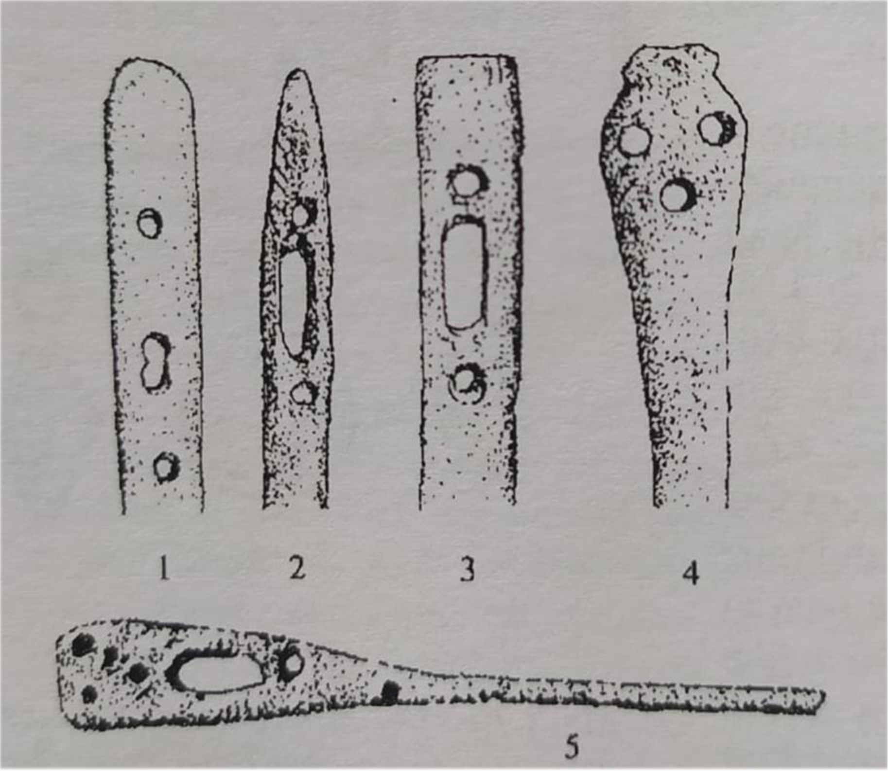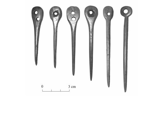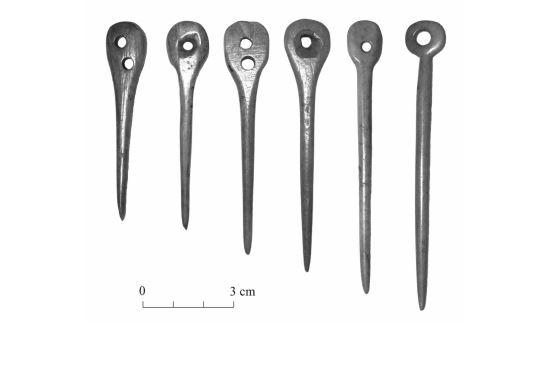 Others similar tools, dated to more recent periods, come from Hungary, where the archaeologists found some bronze pointed tools with a wider proximal part and very large holes: these were interpreted as pins as well (Birò, 2005, p.204) (See Figure 4b).