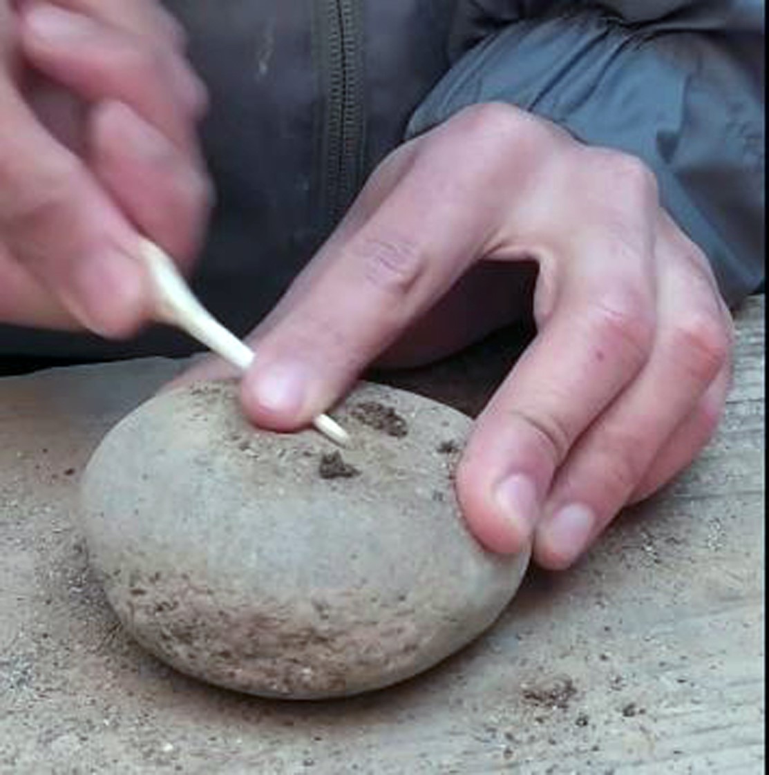 During the façonnage phase, two techniques were used: scraping and abrasion. For the first technique, I used a modern metal chisel to eliminate the hardest parts of the blank in order to give it a preliminary circular shape and thus shorten the manufacturing time (See Figure 8b). For the second technique, I used limestone with sand, and the blank was wetted several times in order to increase the power of abrasion needed to shape the object and, specifically, to create the active part (See Figure 8c).