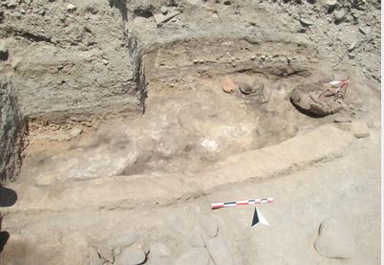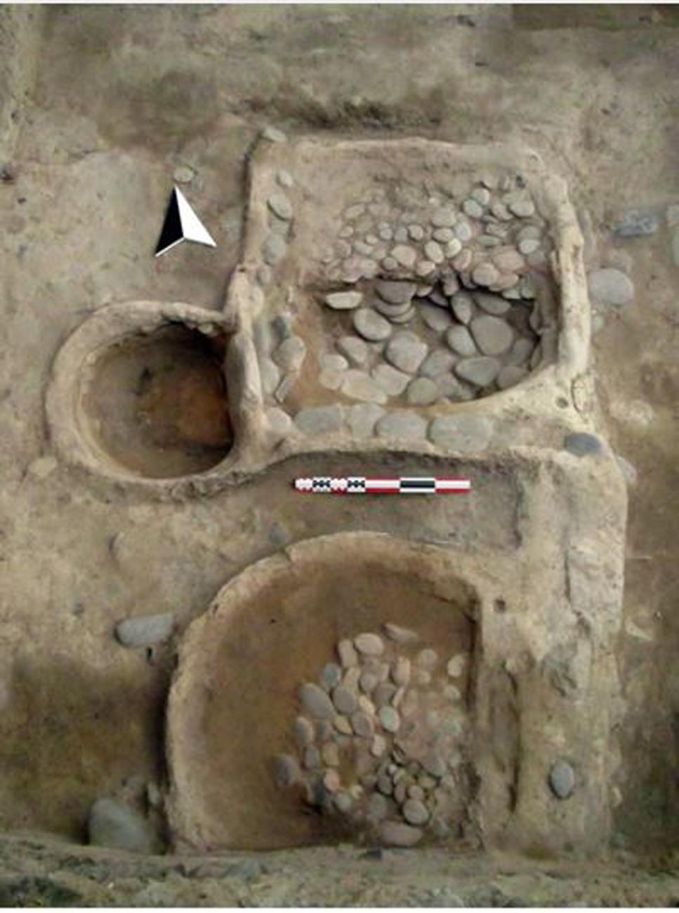 During the following periods (especially during the Late Bronze/Early Iron Age periods, 15th-7th centuries BC), the site was remodelled: stone walls were built along its perimeter, which were interpreted as belonging to a terracing system aimed at enlarging the available space on top of the mound. In fact, in this period, the site shows an important increase in population, as suggested by the large number of contemporary graves discovered in the nearby cemetery (Doghlauri). The excavated areas on both sides of the Main Mound brought to light different open areas located at its periphery, where multiple cooking fires devoted to food preparation were found (See figure 2d).