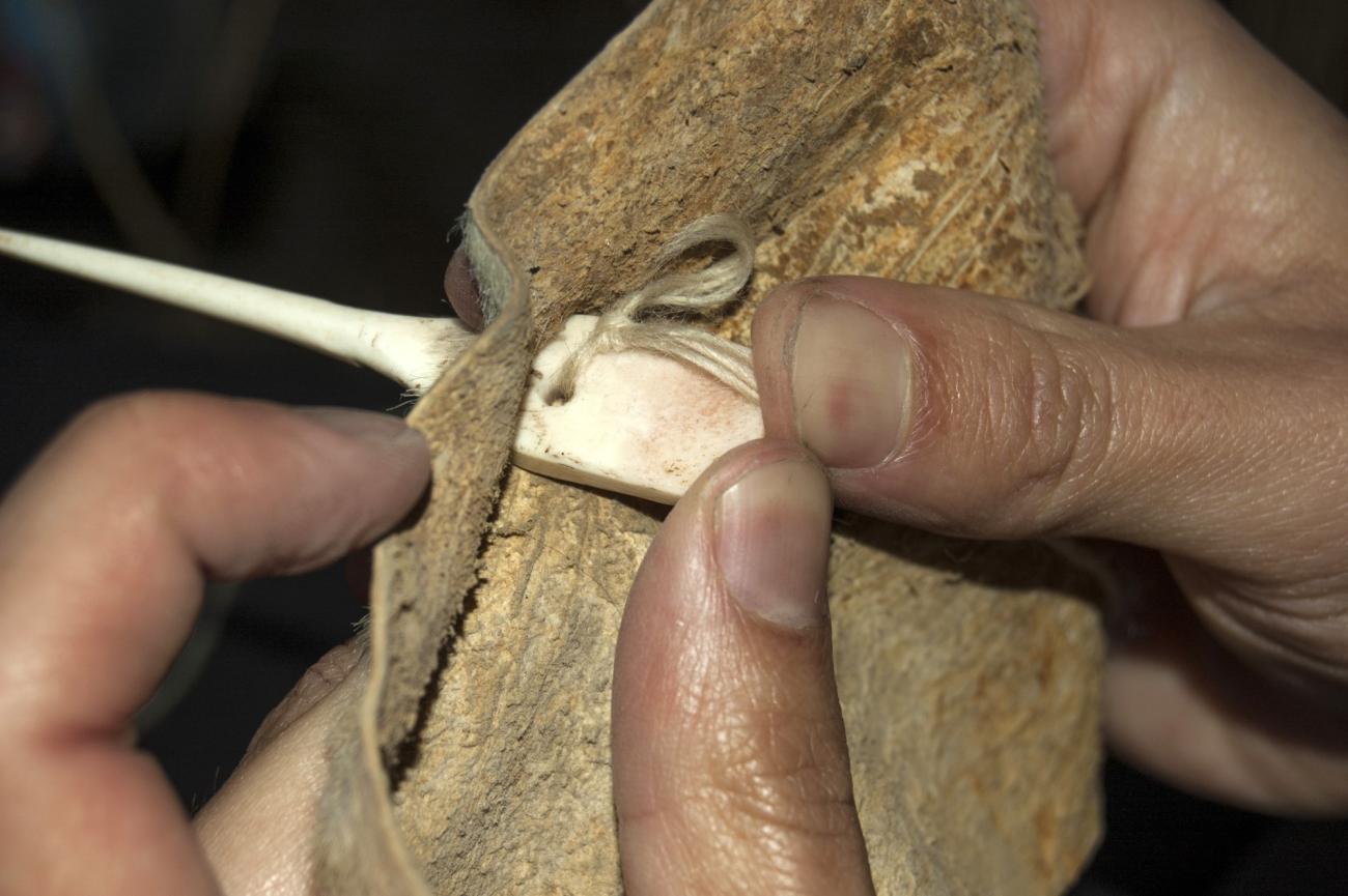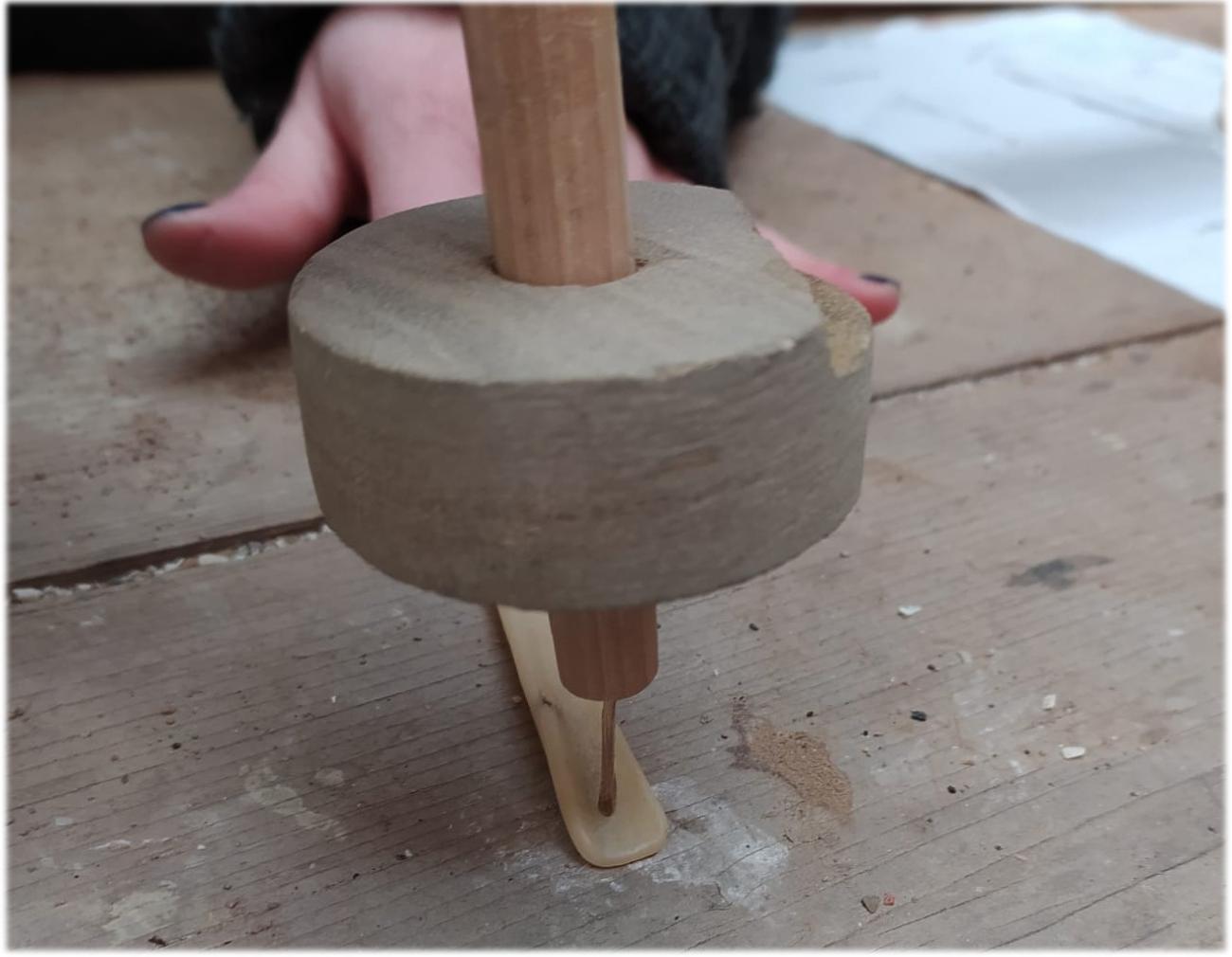 The last step was to create the eye in the proximal part. The technological traces identified in the previous analysis led to the hypothesis that they were created with a drill-type mechanical tool. For this reason, I used a pump drill equipped with a bronze point4 (See Figure 8d).