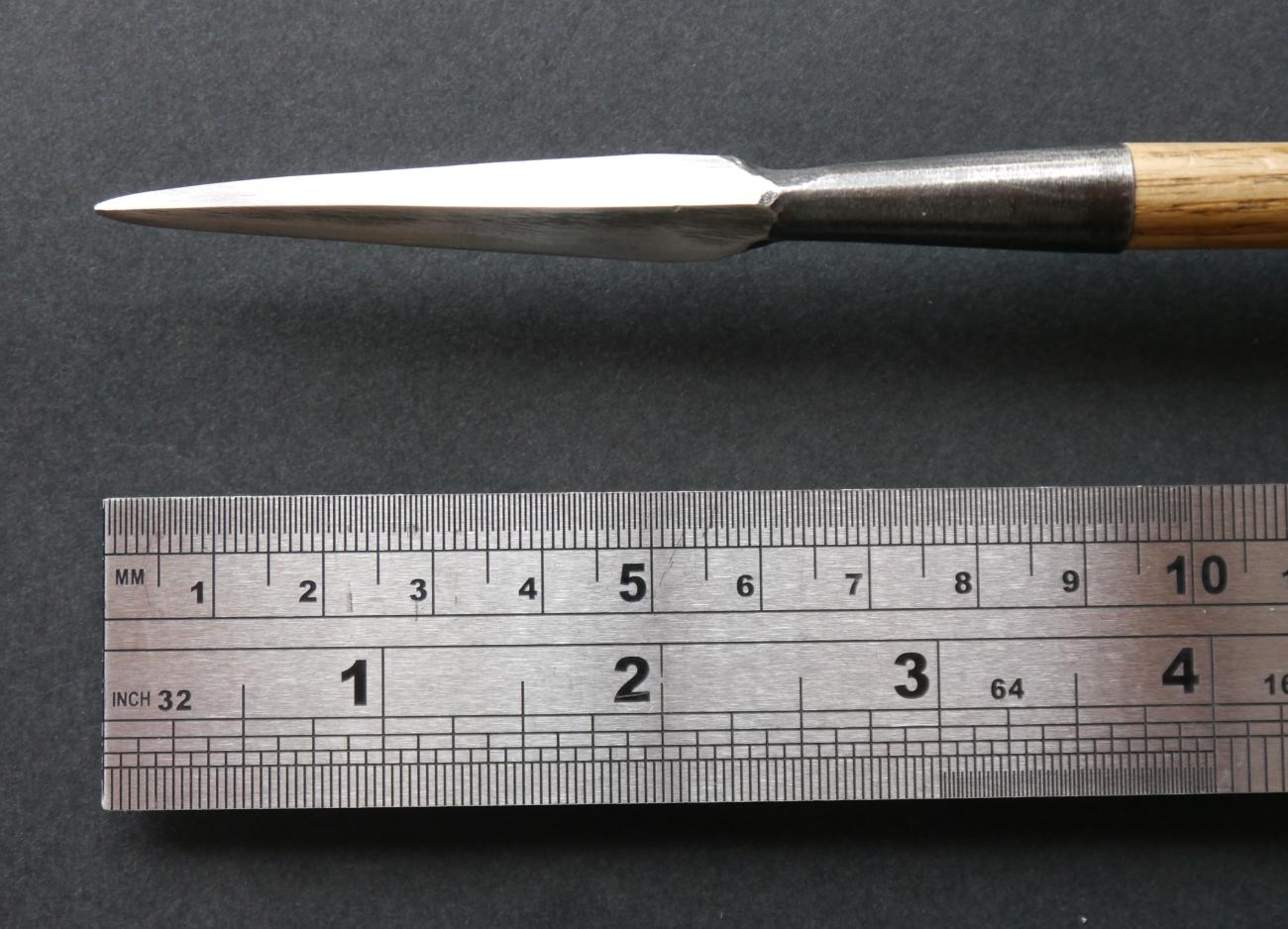A reproduction M8 long bodkin arrowhead is shown in Figure 2. When shot from a bow of moderate strength (about 70 lb, 311 N) an arrow with this head is capable of penetrating mail armour to a potentially lethal depth, exceeding 40 mm at almost every shot, unless there is a substantial thickness of padding beneath the mail. To a large extent the degree of protection is determined by the thickness of the padding. In one series of tests, with a bow of 65 lb (289 N) draw weight, a15 mm thickness of compressed woven linen under the mail was needed to prevent penetration exceeding 10 mm (Jones 2020, p. 169).
