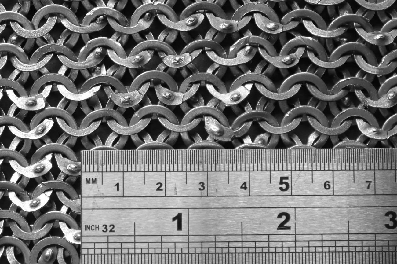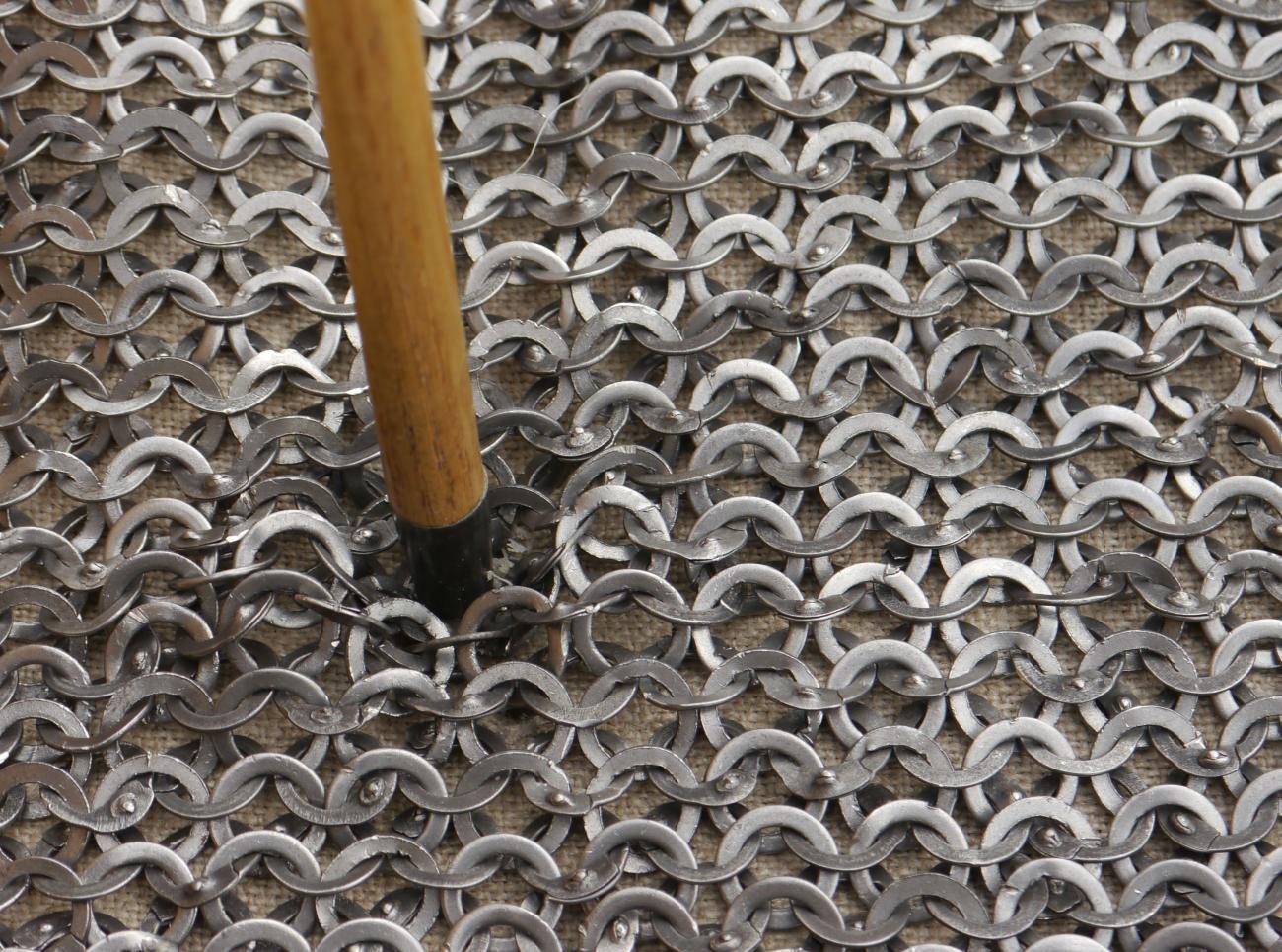 Mail and underlying linen were pinned to a polyurethane foam target boss, and shots were made from a range of 9 m. Penetration was measured to the nearest millimetre, from the back of the last linen layer to the tip of the arrow. Ten replicate shots were made for each mail and linen combination. The position of damage was marked on the mail and linen, and any hit close to previous damage was discounted. A note was made of whether the tip of the arrow had first passed through a riveted or solid ring. After no more than five hits the mail was carefully inspected and all damaged rings were cut out and replaced, maintaining the original pattern of alternating rows of solid and riveted rings. The replacement of a solid ring also required the replacement of the four surrounding riveted rings.