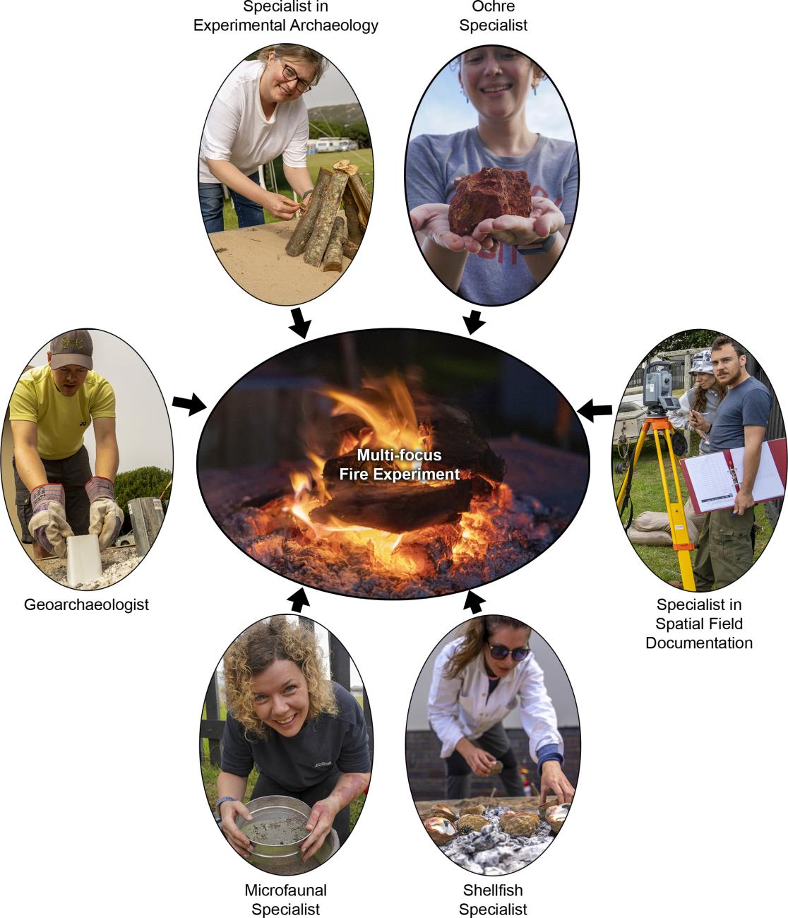 Hearth formation processes are complex. They involve multiple actions, reactions, and activities before, during, and after an active fire and can also impact a wide range of materials and sediments at an archaeological site. Archaeologists approach combustion features and formation processes from multiple analytical perspectives. However, many experimental studies are limited to a strict analytical focus on a single or very few fire-related aspects to allow for careful control of specific variables. Six researchers report here on a multi-focus experimental approach in order to understand complex fire practices and heat-induced alteration of micromammals, ostrich eggshell fragments, mineral pigments, shellfish, and sediments. We designed and conducted five experiments with a state-of-the-art 3D documentation setup, active fires, and excavation through photogrammetry and spatial recording. We provide a brief general account of the experiments and an overview of the experimental design before comparing single-focus and multifaceted experiments and pointing to some of the benefits of our approach and potential areas for improvement. Multifaceted experiments are complex and resource-demanding, and proto-experiments should ideally be part of the experimental design. Our 3D recording and collaboration on documentation strategies provided a wide range of data that can further our understanding of prehistoric combustion features.
