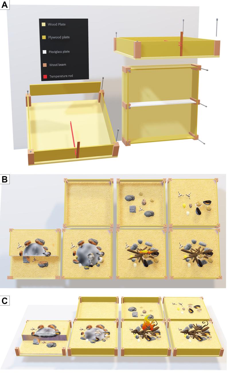 To achieve robust spatial control over sediments, material, and physical properties such as heat distribution and moisture content, we designed and created a standardized physical recording environment – a fixed-sized sandbox – in which the experiments would be conducted (See Figure 2). The known format of the boxes allowed us to pre-plan each individual experiment in terms of their spatial layout and material integration. The design of, and results from, previous experiments (e.g., Bentsen, 2012; 2013; 2014; Mallol et al., 2013b; Sievers and Wadley, 2008) have demonstrated that a 100 x 100 cm surface area would be sufficient for our experiments and a substrate thickness of 30 cm would accommodate for the predicted alterations occurring below the fire. Our boxes thus had an interior base of 100 x 100 cm and a height of 30 cm. The modular design allowed for easy packing, transportation, and assembly and ensured that the experiments could be conducted in any location with minimal impact. Four identical boxes were constructed and used during the experiments and can be reused in the future.