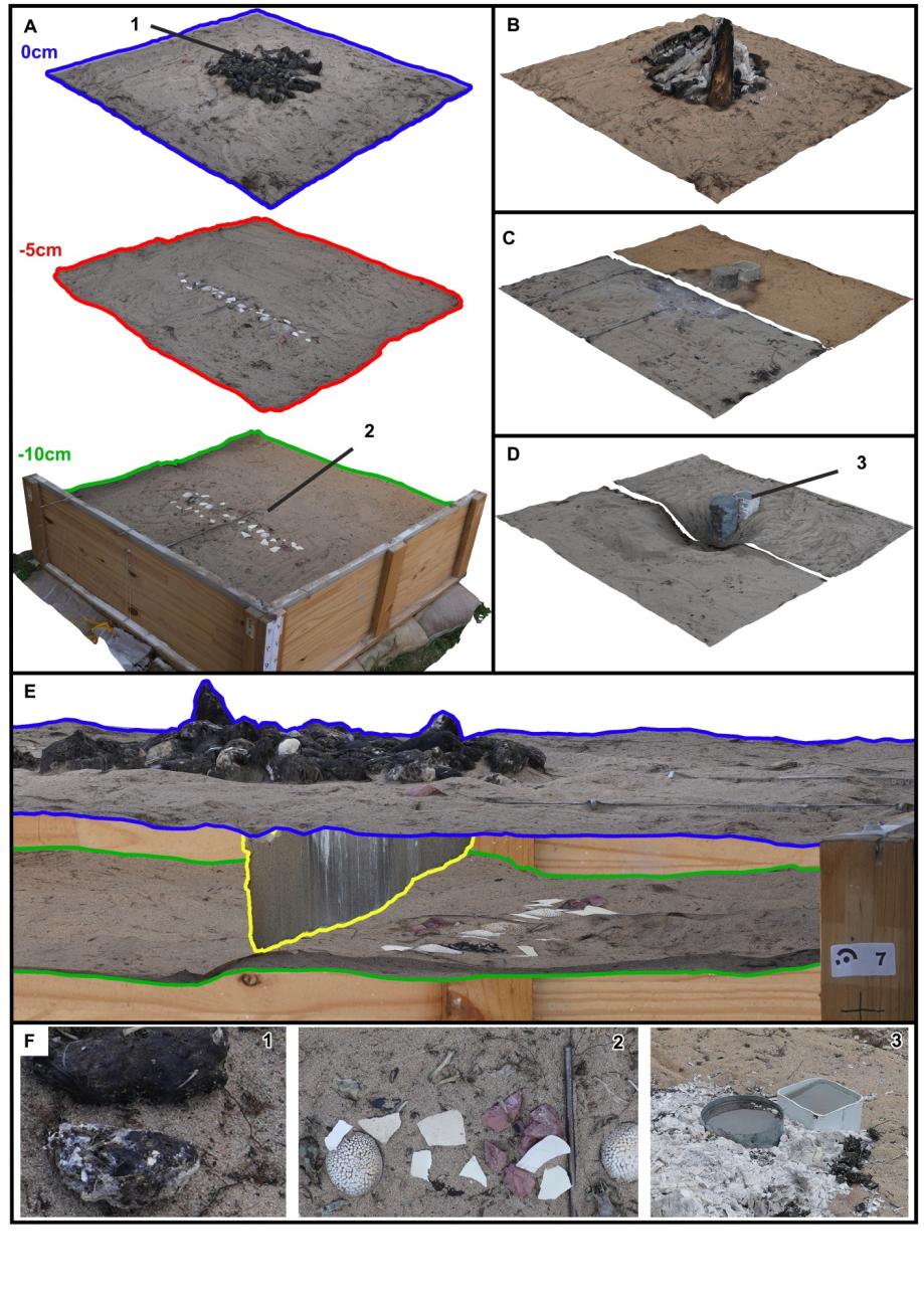 The photogrammetric recording was carried out before and during the active part of the fire experiment, as well as at regular intervals during the post-fire excavation (See Figure 7). While we are still in the progress of synthesizing this data, it is already clear that this method provides a wealth of information. Especially in terms of documenting precisely the placement and potential movement of the material embedded below and in the fire, as well as the spatial relation between the temperature probes and the location of combusted material.