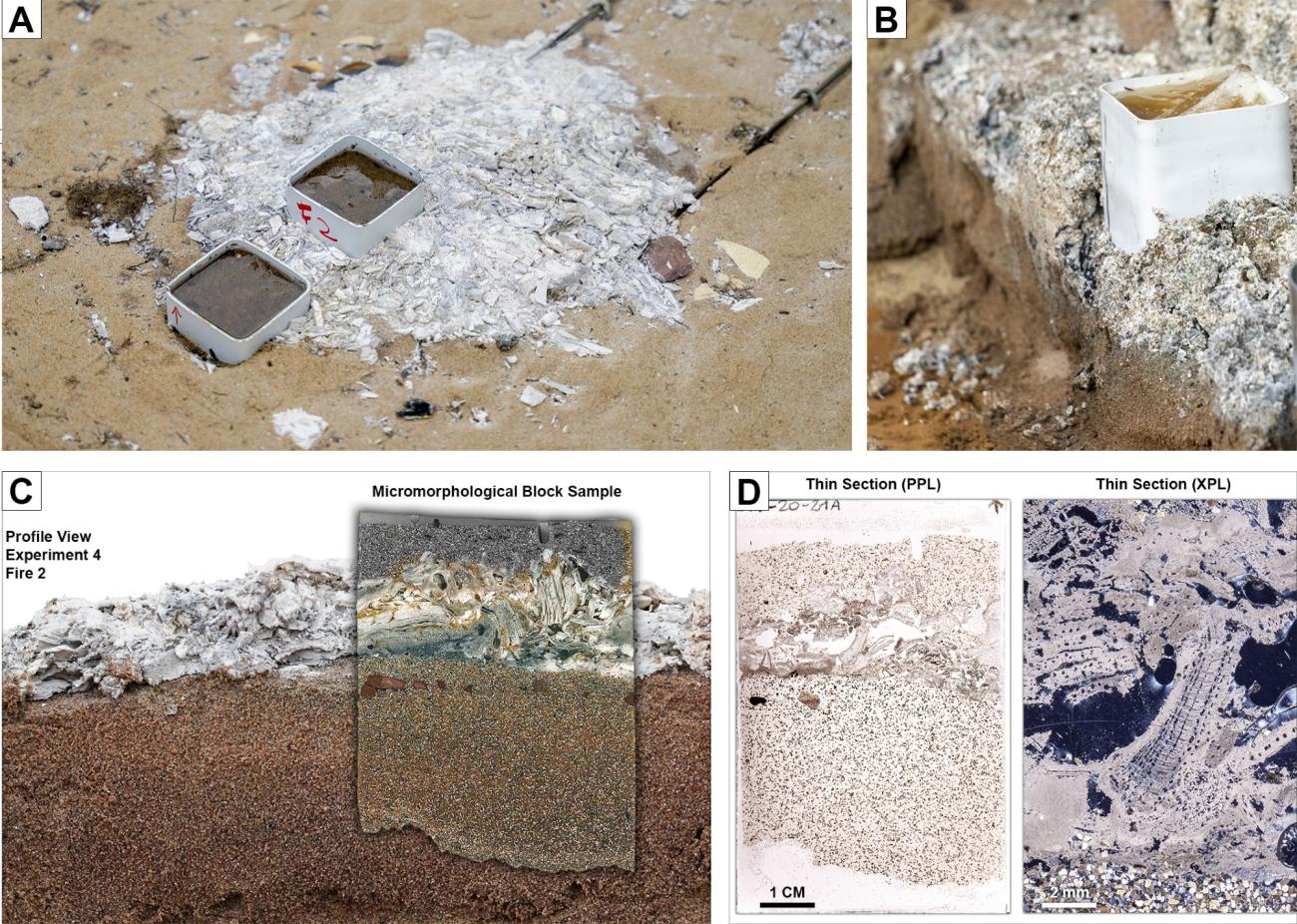 The micromorphological samples collected from the fire experiments provide information on the sedimentary content and internal microstructure of the fires, as well as the effects of heat on the substrate. Oriented block samples provide a unique, in situ glimpse of the sedimentary signatures associated with various hearth- and fire-related activities (See Figure 18).