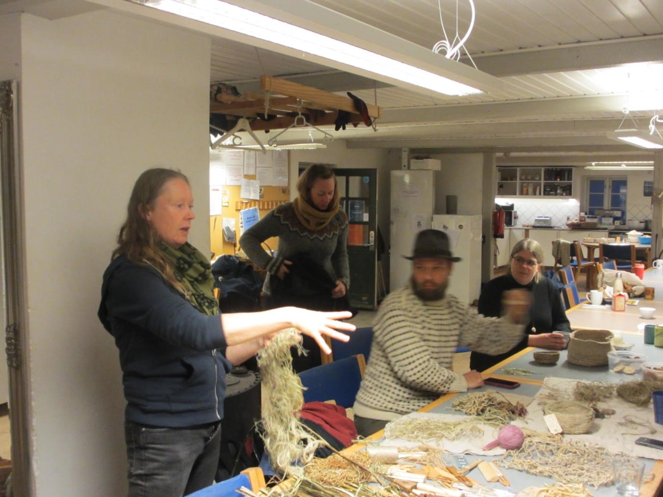 After a coffee break Joakim Løvgren held a workshop about historical fencing. He presented the problems of our loss of knowledge of medieval fencing, but also on his attempts to recreate the skill from descriptions from the period. The participants were then invited to reenact fencing with wooden swords based on a short demonstration by Joakim and copies of German medieval descriptions. After this Kari Marie Helland held a workshop on nettle fibres, cord, and net binding, demonstrating a wide variety of crafts made from nettles including their archaeological contexts. The participants themselves were given the opportunity to try techniques of making cord from nettles that Kari had brought along.