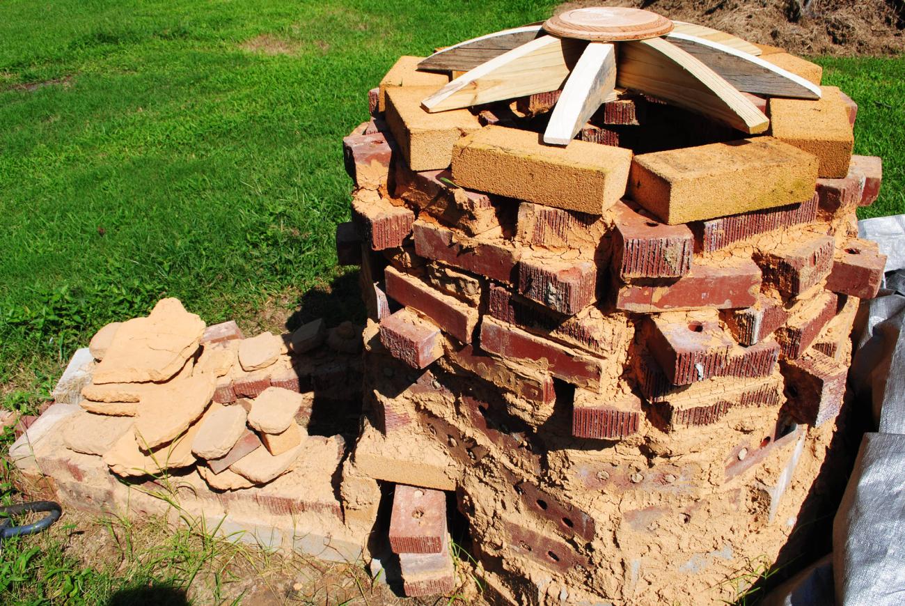 The pilot test firing was conducted to test out the strength of the kiln as well as to see if the dome that was built out of two triangular mudbricks and clay coils could hold up on its own (See Figures 10a and b). Also, cones were not added inside because the first initial goal was to just dry the dome. The dome was supported by a wooden frame just in preparation for the clay dome (See Figure 11). There was some speculation that this dome may not work due to the nature of the triangular mudbricks and the clay having different moisture content.