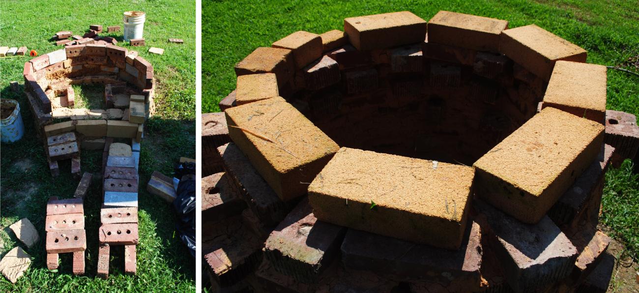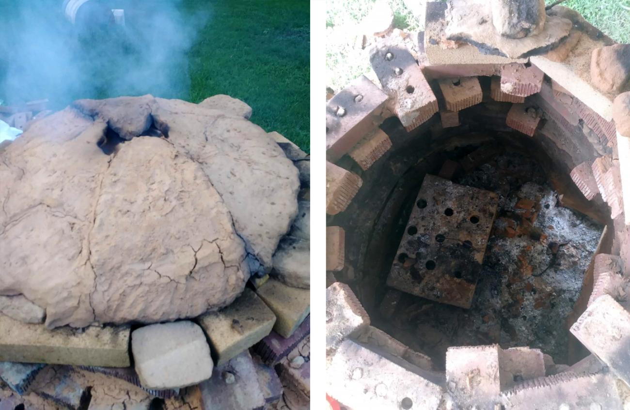 After a visual plan was made, the work was put in over two months with the total of 197 bricks (including industrialized bricks, mudbricks, and firebricks) that resulted in weighing approximately 310.7kg with approximately 181.44kg in the clay mortar (using the same formula as the mudbricks). The total length of the kiln was 290cm with the flue being 160cm and the combustion chamber being 115cm long by 79cm wide. Inside the kiln, mudbricks were laid down with the hopes of retaining heat upon firing. A perforated ceramic slab was added to act as a shelving unit for the large scored basin. On each side of this slab were small mudbricks that were attached to the kiln walls and the industrial brick to act as small shelves for the pilot test versions of the scored basin. Once the kiln construction was underway, plans were made to close the top (See Figures 9a and b). This proved to be a very difficult aspect and resulted in two pilot tests of the dome and one final temporary dome that had been decided on after the firing pilot test. Below are the different firings that occurred sparsely throughout a two-week time span and their results.