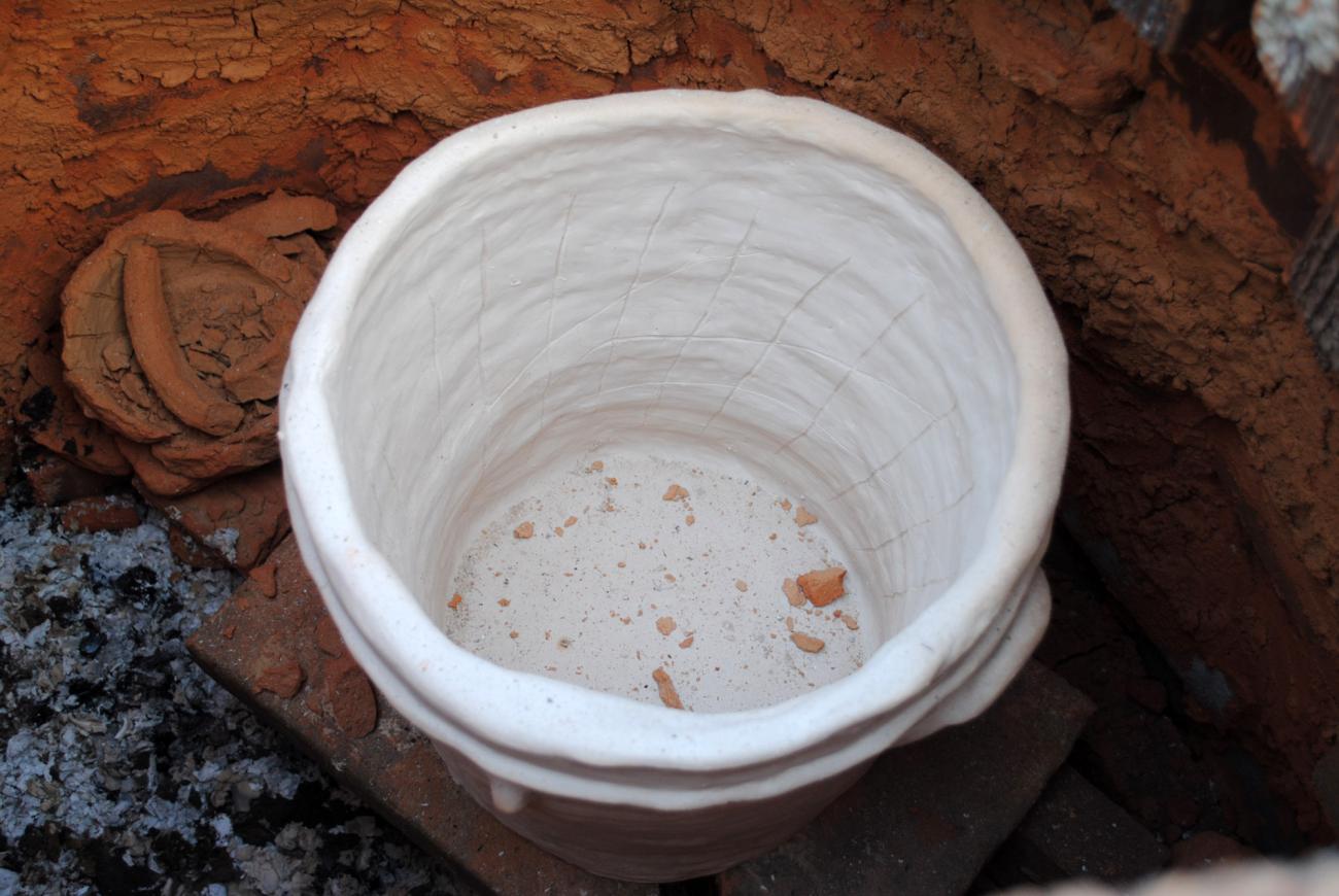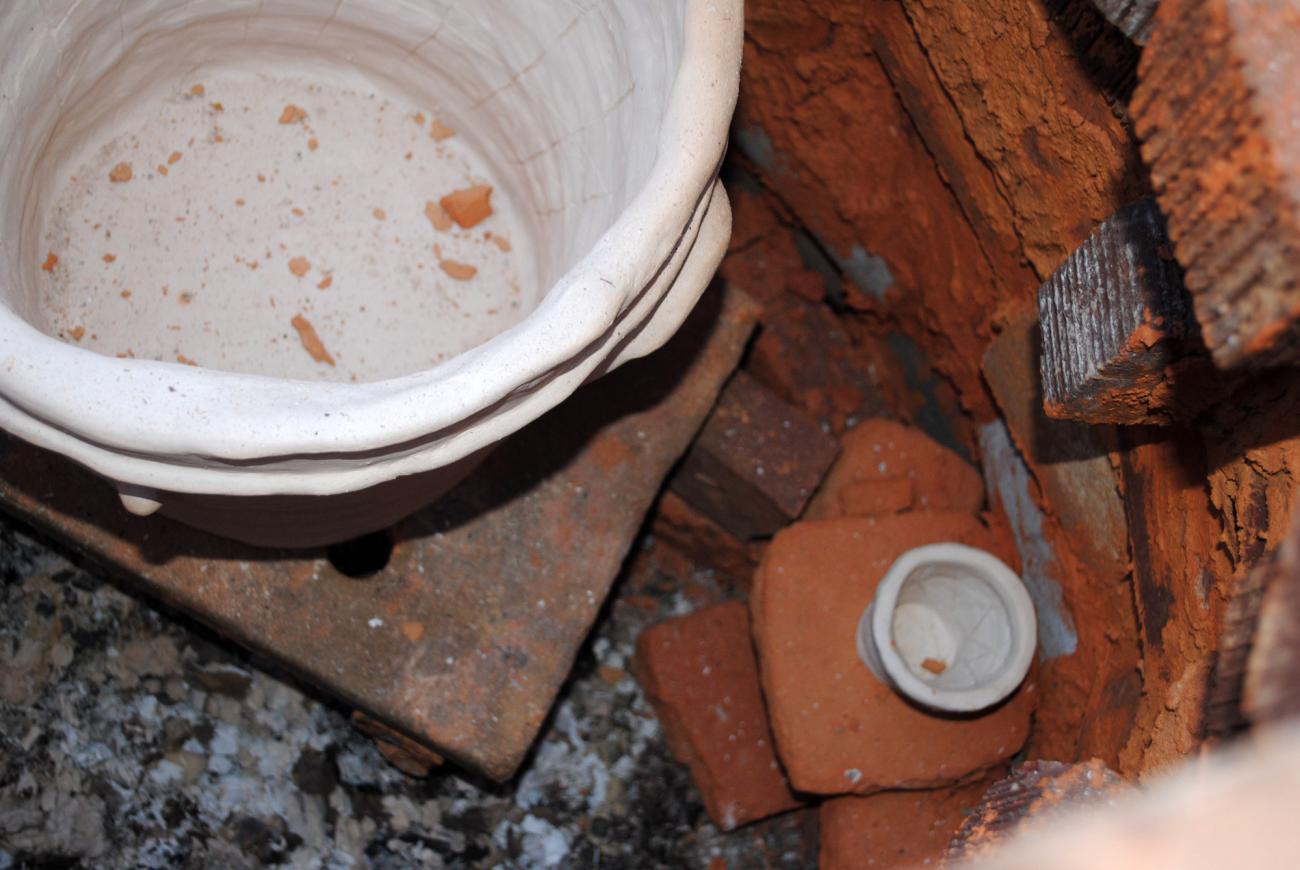 After those last hours, the kiln was completely closed after a final stoking. Covering up the kiln took approximately fifty minutes and involved the application of slip from the local clay and newspaper. This was a very important step that was needed in order to cover all the holes and any cracks that developed throughout the long firing process. The kiln was left to cool down very slowly so that none of the ceramic vessels would be damaged.