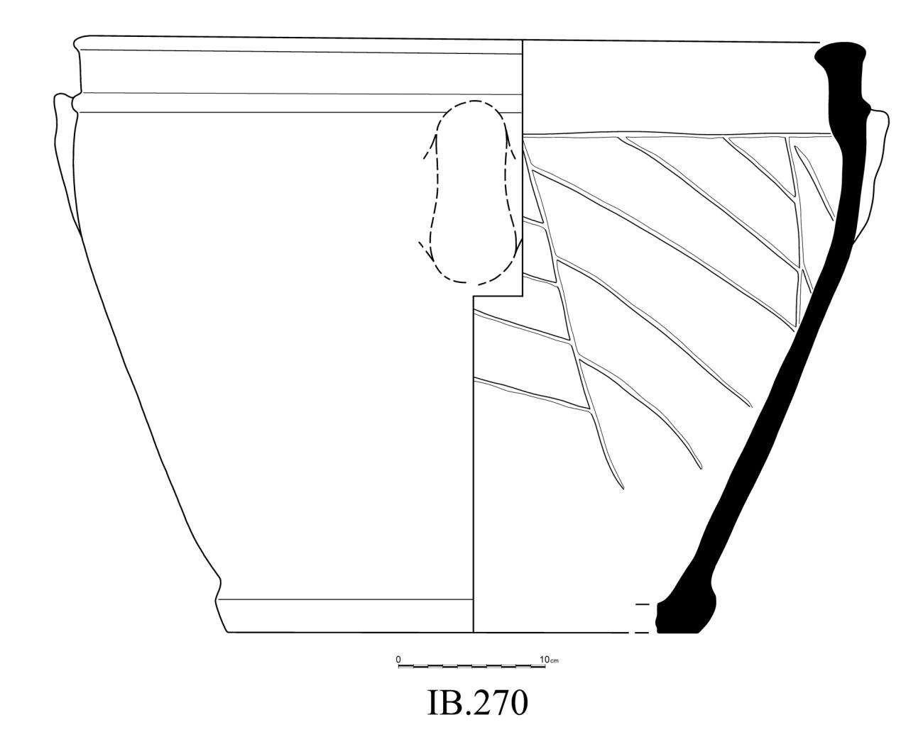However, when the visual analysis was made upon the red clay pilot test it seemed to replicate a similar color and style of the IB.270 scored basin. The scoring was made the same way as the stoneware clay pilot test, the same pottery was used as well. A difference between the two pilot tests was that this version had a wider mouth and body as well as the application of the handles. Although the hand-building technique went smoothly, the base of the red clay vessel within the interior suffered some cracking upon the firing process. This may have been due to how the clay may not have been fully processed even though it took a total of two hours to mix the water and dry clay by hand. The moisture and small particles within the matrix of the clay may not have benefitted the vessel in the long run.