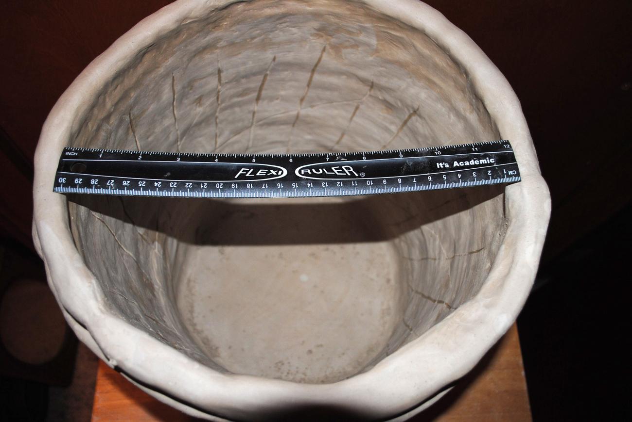 After the pilot test firing that was described above, a new dome was created. This dome was made out of stoneware that was purchased at a local pottery shop and was the same quality as the small version of the scored basin. The idea was that by creating this temporary dome out of clay that was already processed and wedged, then it may work. The construction of this took approximately four and a half hours using the coil and slab technique. This temporary dome was left to slowly dry over the duration of several days until the first firing took place. However, the dome did not survive the drying process due to the uneven hardening of the clay which resulted in cracking.