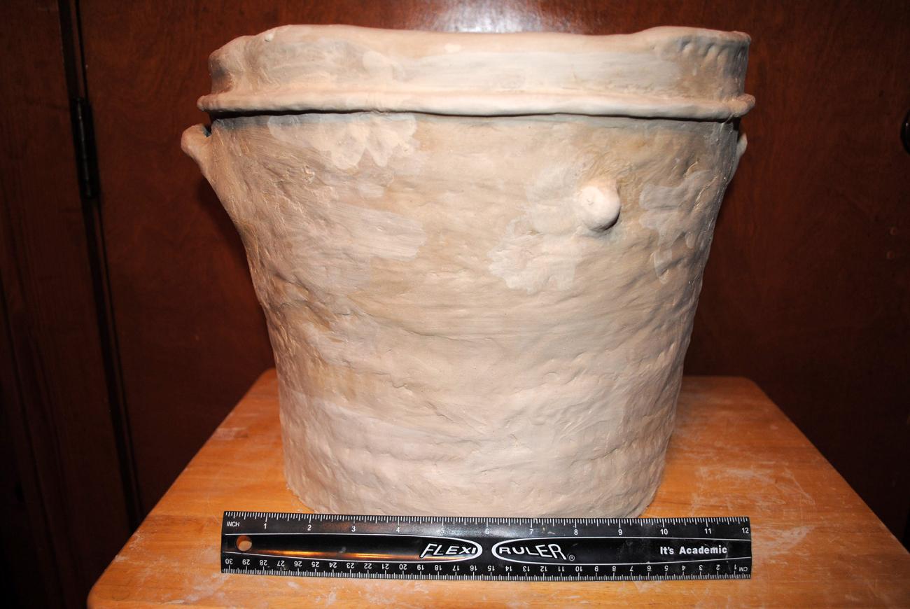 Regarding the pilot test versions of the ceramic vessel, the stoneware clay seemed to have consumed the least time in this portion of the experiment. Stoneware was purchased through a local pottery shop. The clay itself was a light grey that turned completely white after the drying phase. The scoring inside as stated above was only designed as an example for the large-scale version. âXâ-scoring the inside of the vessel was done using the slightly sharp end of a pottery tool.