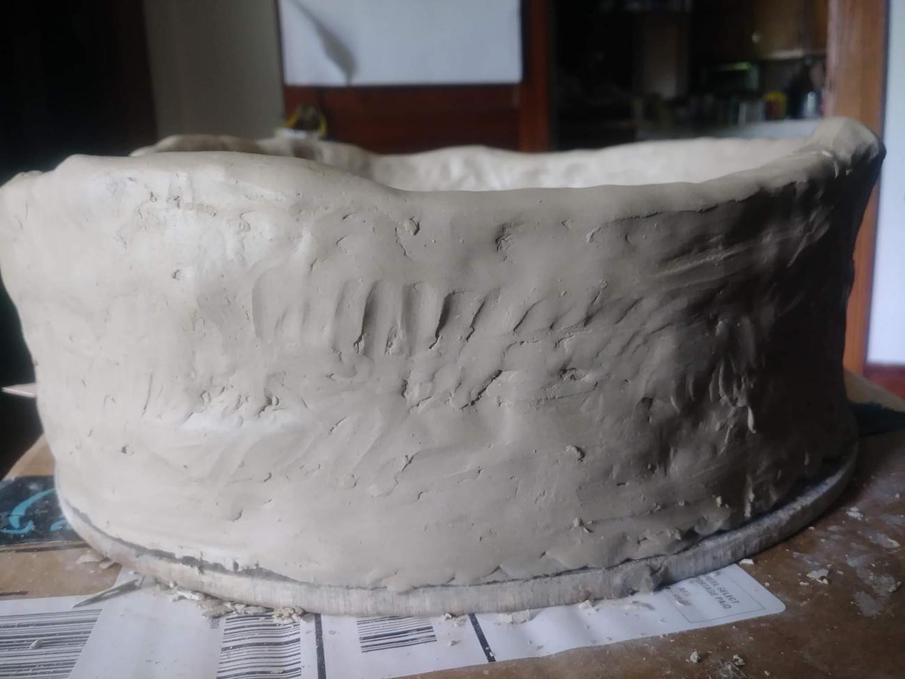 In the end, the large-scale version of the scored basin suffered various complications during construction. The process of drying seemed to go too quickly, and this resulted in various cracks on the exterior as well as the interior of the vessel. In order to fix these flaws, at first, the initial instinct was to try to get the entire vessel wet again, by using a spray bottle to liberally allow for water to seep into the pores of the clay. After this, scoring occurred in order to allow for the attachment of small pieces of the clay. However, none of this seemed to work, so another technique was used and that was the creation of slip. This technique is used amongst modern-day potters in order to restore their ceramic vessels and help prevent further cracking upon the firing process (Casson, 1977). This alternative technique seemed to work, and the ceramic vessel was then documented through photographs and put into a safe place to prevent any other damages. All three vessels that were created through this portion of the project were set aside for the kiln firing that took place a couple of days later.