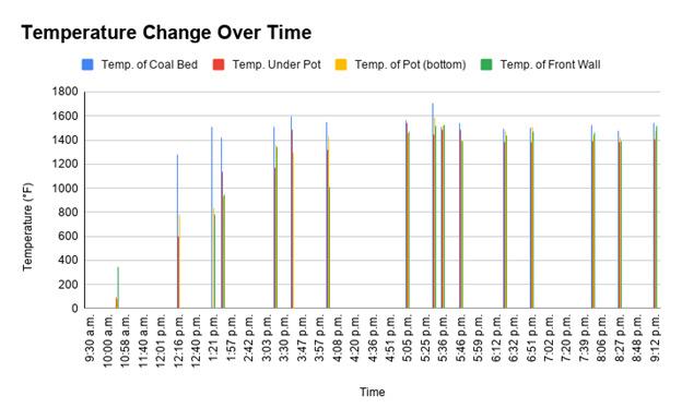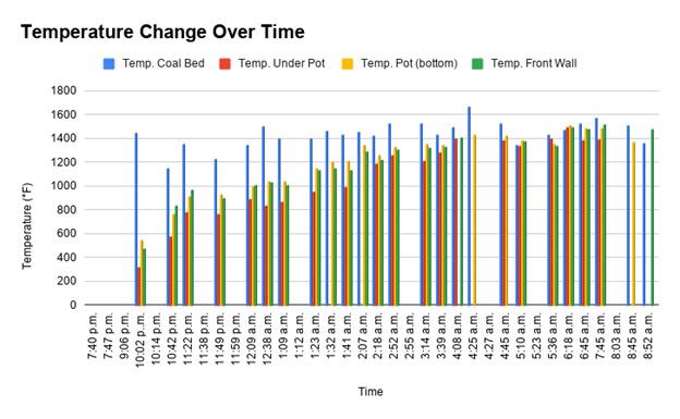 The first firing indicated that the vessels did not properly reach the temperature needed that would change the clay into a non-porous vessel. A second firing was, therefore, necessary, the difference being that this firing began during the night and went for a longer period. The recordings were more focused on the temperatures coming from inside the kiln, the quantity of wood and the time it took to reach certain temperatures. There were shorter stoking times (beginning with 10 minute intervals and then changed to 5 minute intervals in order to get the temperature higher ), so that the fire would be continuously fed but this may have affected the temperatures rising due to the doorway opening all the time causing the fuel to cool and fluctuate. The second firing lasted a total of fifteen hours, with approximately 36.27kg of fuel (the same type of wood as before) and the ending temperature was around 1500 °F (See Graphs 1 and 2).