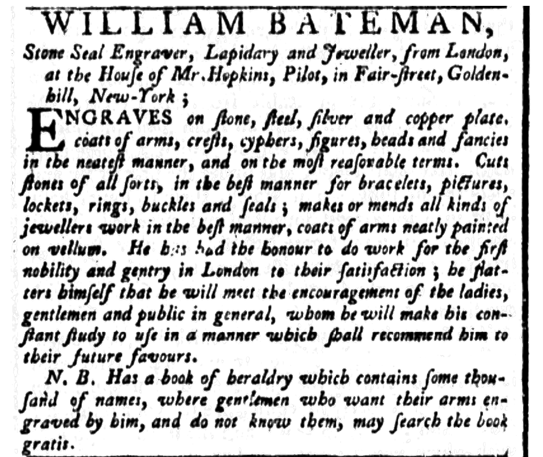 Bateman, W., 1774. New York Gazette and Weekly Mercury, Nov 7, 1774.