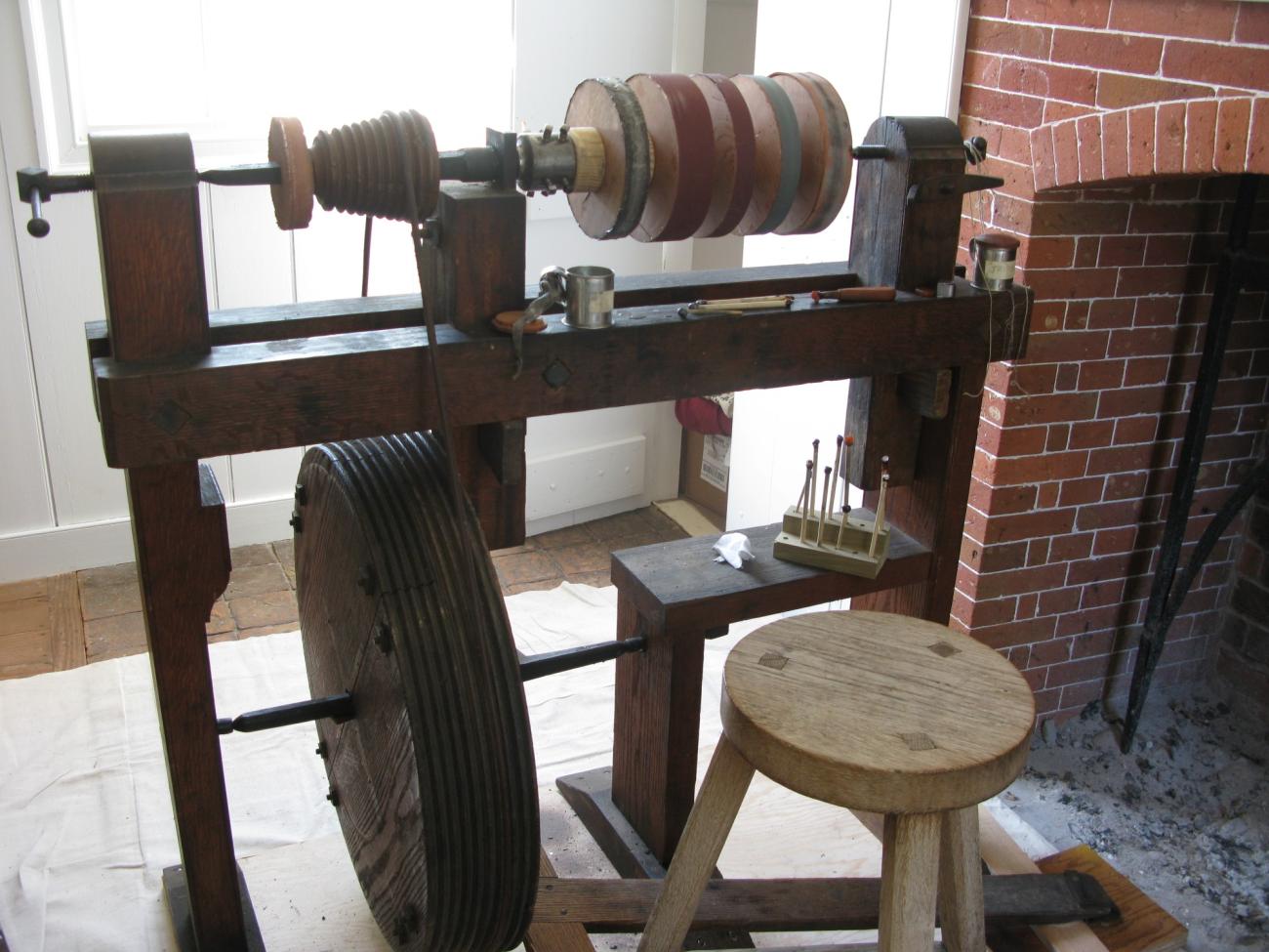 The wheels were eight inches/20 cm in diameter and ranged from 1 ½ to 2 inches/3.8 to 5 cm wide. Four of the wheels were designated for grinding and sanding and two more for polishing. Commercial wet/dry sandpaper (220, 400, and 600 grit abrasives) were adhered using hide glue to the edge of two wooden wheels, and a replica sandpaper made of linen tape, hide glue, and 150 grit emery powder was glued to the edge of the fourth wooden wheel. A fifth wheel had belt leather glued to the edge of a wooden wheel for use with Tripoli and tin oxide (See Figure 3). In addition, two four-inch/10 cm diameter wheels of walrus hide were cut. One of the walrus hide wheels was mounted on the lathe and the other shown to visitors. The wheels were arranged with spacers with the coarsest on the left and progressing to the finest on the right, ending with a leather wheel that would be used with Tripoli (See Figure 3 and 4). The walrus hide wheel was placed by itself on the far left so as to avoid contamination. The arrangement of the wheels and the position of the lathe in the shop was chosen to allow the visitors to be able to see the lathe in action with as little obstruction as possible.