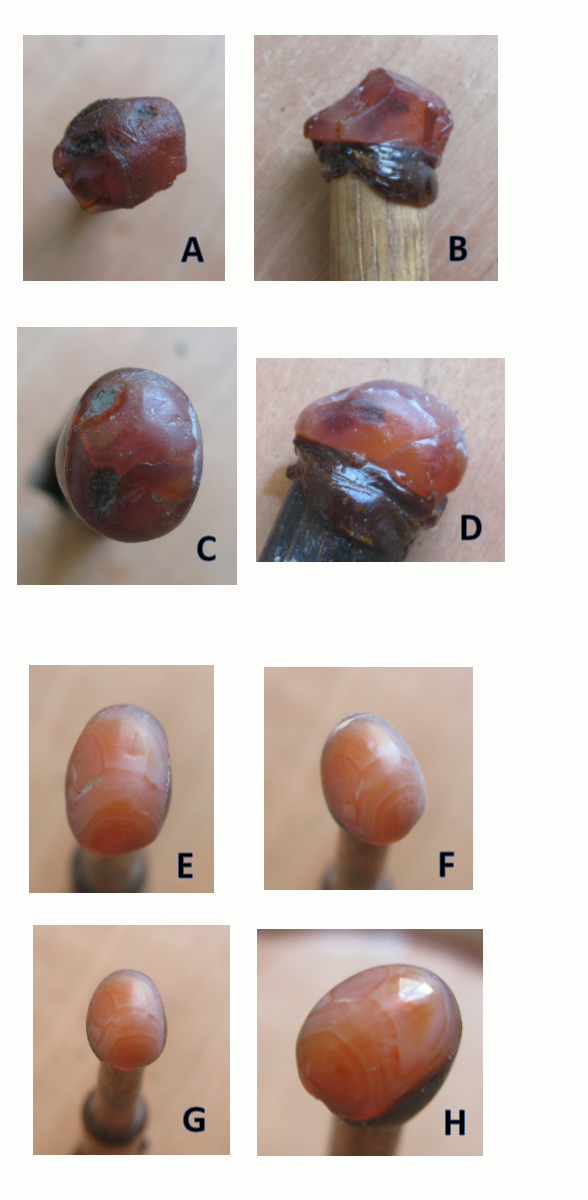 Holtzapffel (1894) describes the process for grinding and polishing carnelians as grinding the rough stone on a lead or pewter wheel with coarse emery and continuing with finer emery. The polishing is done on a lead wheel with “a plentiful amount of rottenstone and water”. Harder stones (e.g., rubies or sapphires) could be polished on a copper wheel (Holtzapffel 1894, p. 32). Chambers (1728) describes a similar process using emery (smalt) and Tripoli for a polish.