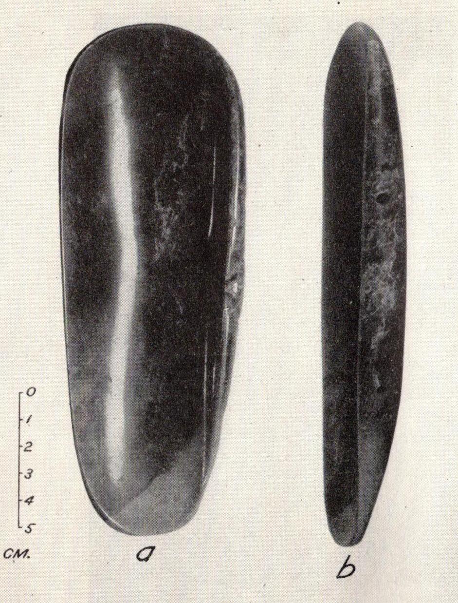 Other Formative period greenstone artifacts have remained enigmatic, however, because they do not have clear counterparts in later Mesoamerican societies. Although many of these objects are often dismissed as ornaments, some – particularly the effigies of natural objects – may yet turn out to have been utilitarian, for many early tools were derived from natural objects whose original form, or only slightly modified form, was well-suited for adoption and repurposing for specific tasks. Clear examples of such tools in ancient cultures would include river cobbles that were repurposed as hammerstones; antler tines repurposed as billet tools; broken animal bones that were repurposed as stilettos and awls; and large thorns used as weaving picks. Likewise, early greenstone artifacts that take the form of natural objects, while originally assumed to be simply ornamental effigies, may in fact represent utilitarian tools. Among these possible tools is a type of Formative period greenstone artifact that has long been identified as an effigy of an elongated bivalve shell, frequently referred to as a “clam shell”4 (Andrews, 1986; Andrews, 1987; Covarrubias, 1946, p.172; Covarrubias, 1957, p.75; Drucker, 1955: Plates 49-50, Plate 36e and 40a-a’; Pohorilenko, 1981, pp.320-321; Stirling et al., 1942, pp.640-641, 649).