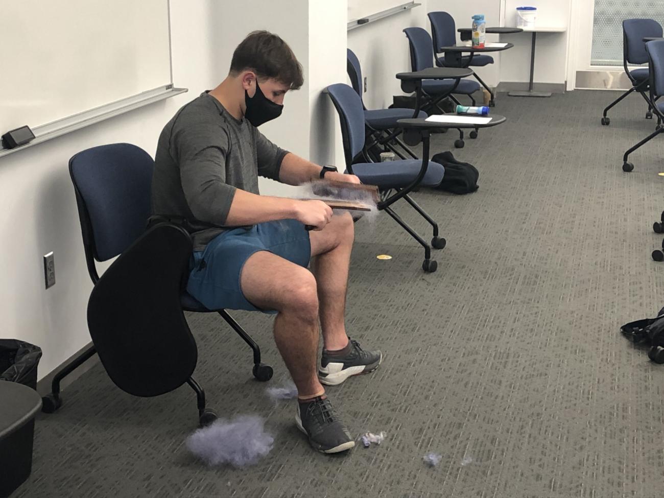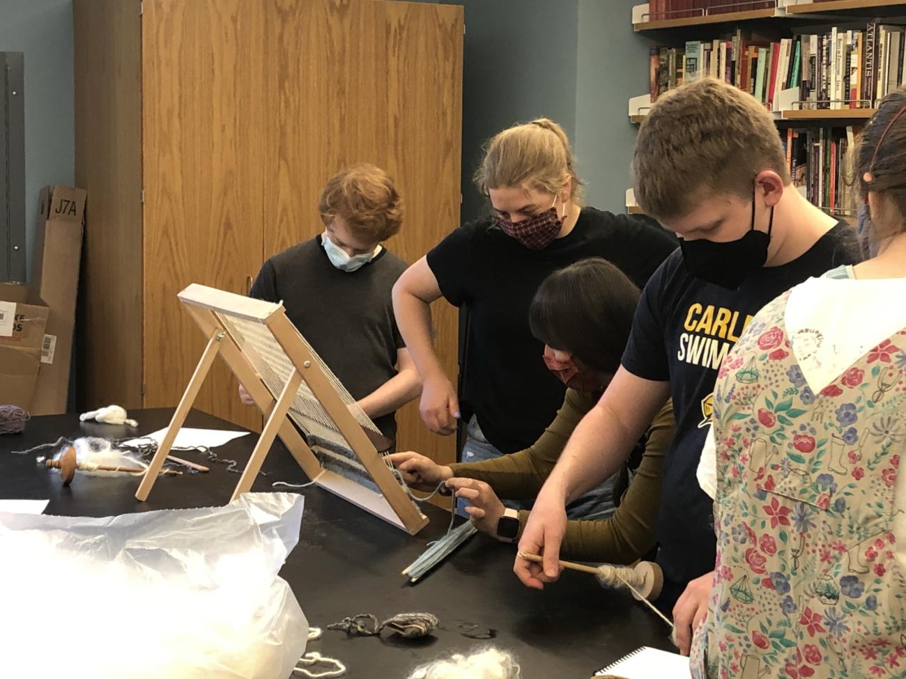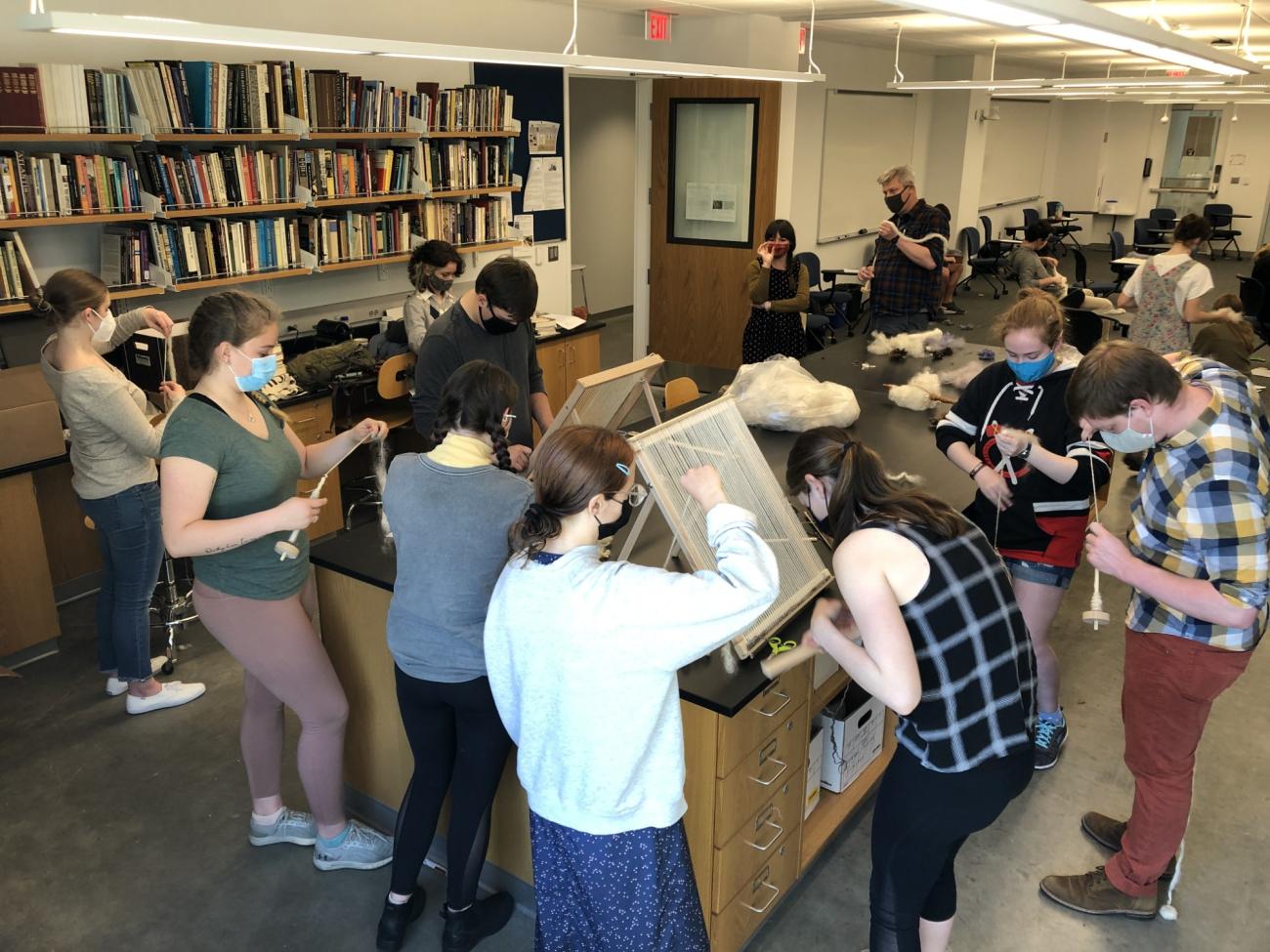 During the Monday and Wednesday classes, the students discuss assigned readings on how wool has been historically processed as well as ethnographic accounts of traditional shepherding societies. In the lab, the students rotate in groups between stations learning to card, spin, and weave, with Alejandra and the professor(s) and TA helping direct each station (See Figures 1-3). Major points that the students experience and discuss within the lab and in Fridayâs class/lab include the dependent relationship of the different tasks to each other â for example, better carded wool leads to finer and easier to spin yarn, and more consistently spun yarn leads to easier weaving; the relative time required by the different activities and the realization that spinning was the predominant activity of many womenâs lives; that these skills are quick to learn but very difficult to master; how different skill sets are required for each activity and why this would lead to specialisation; and that these tasks lend themselves to social activity. Each of the insights open up new avenues for investigation, and by the Friday lab debrief discussion the students are asking a whole new set of questions of the sources examined earlier in the week.