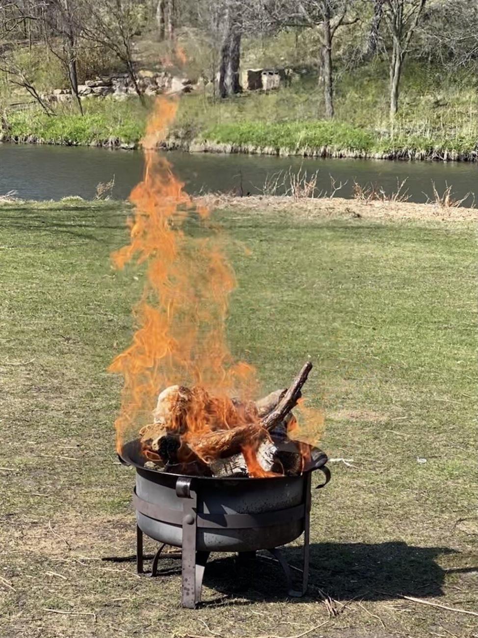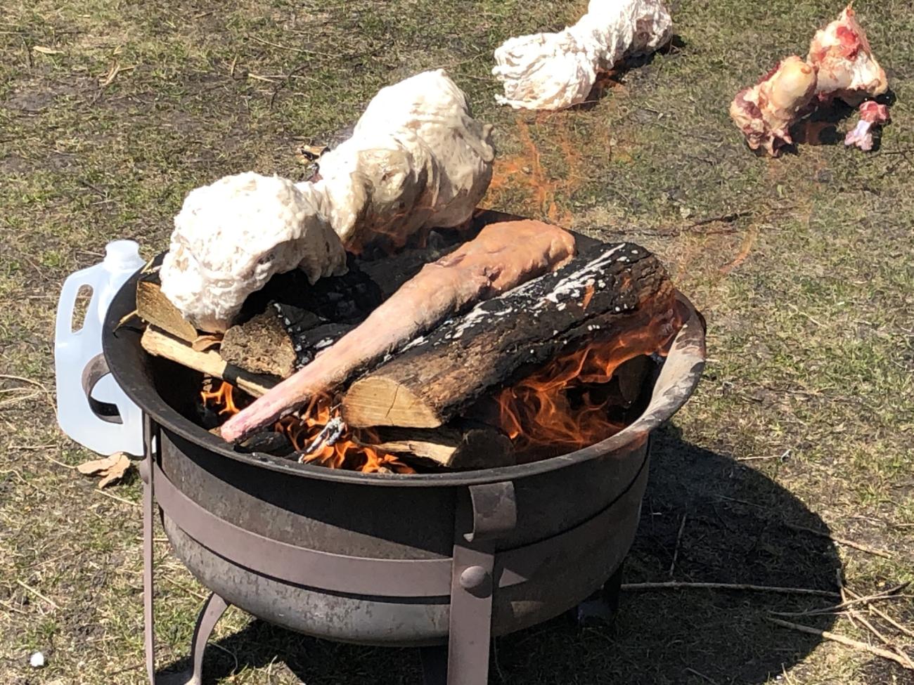 On Monday and Wednesday, students discuss assigned ancient images and accounts of sacrificial rituals, as well as scholarship on modern recreations and sacrifice in general. For the lab, the students return to the same fire pits they used the previous week. They burn fat-wrapped beef femora, bare (not wrapped in fat) femora, and oxtails on the fires, all while carefully recording all aspects of the event (See Figures 9-12). At the end of the lab, they carry the burnt femora across campus to the Archaeology Lab to determine if these remains could have been transported when burnt, as apparently occurred at the Bronze Age palace at Pylos, Greece (Isaakidou et al., 2002), and for further study. Morton uses beef femora and tails for in-class experiments rather than lamb femora, because they are much easier to find at butcher shops, and they are significantly larger and thus make for more dramatic results. While this lab has the strongest focus on scientific experiment of the three-week unit, it also has a strong experiential component, as the students are aware of, and documenting, their reactions to this ritual act both individually and as a community.
