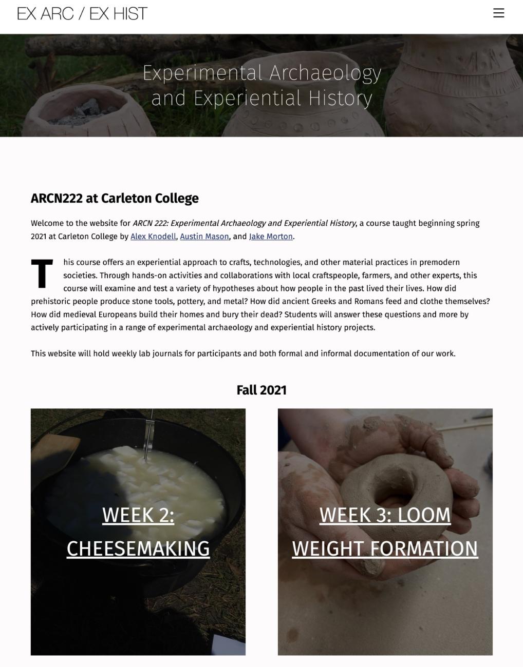This paper discusses an Experimental Archaeology and Experiential History course that Austin Mason (Director of Digital Arts & Humanities and Lecturer in History) and Jake Morton (Assistant Professor of Classics) developed and teach at Carleton College, a small liberal arts college in central Minnesota. We hope this paper leads to discussion and collaboration with people teaching similar courses, and also helps people get their own courses of this type started. We developed and co-taught the first iteration of this course (along with our colleague Alex Knodell) in Spring 2021, and plan to regularly rotate teaching duties in years going forward; Mason taught the course in Fall 2022, and Morton will teach the course in Spring 2023. We hope to follow up this article every two years with new discussions on the courseâs development.