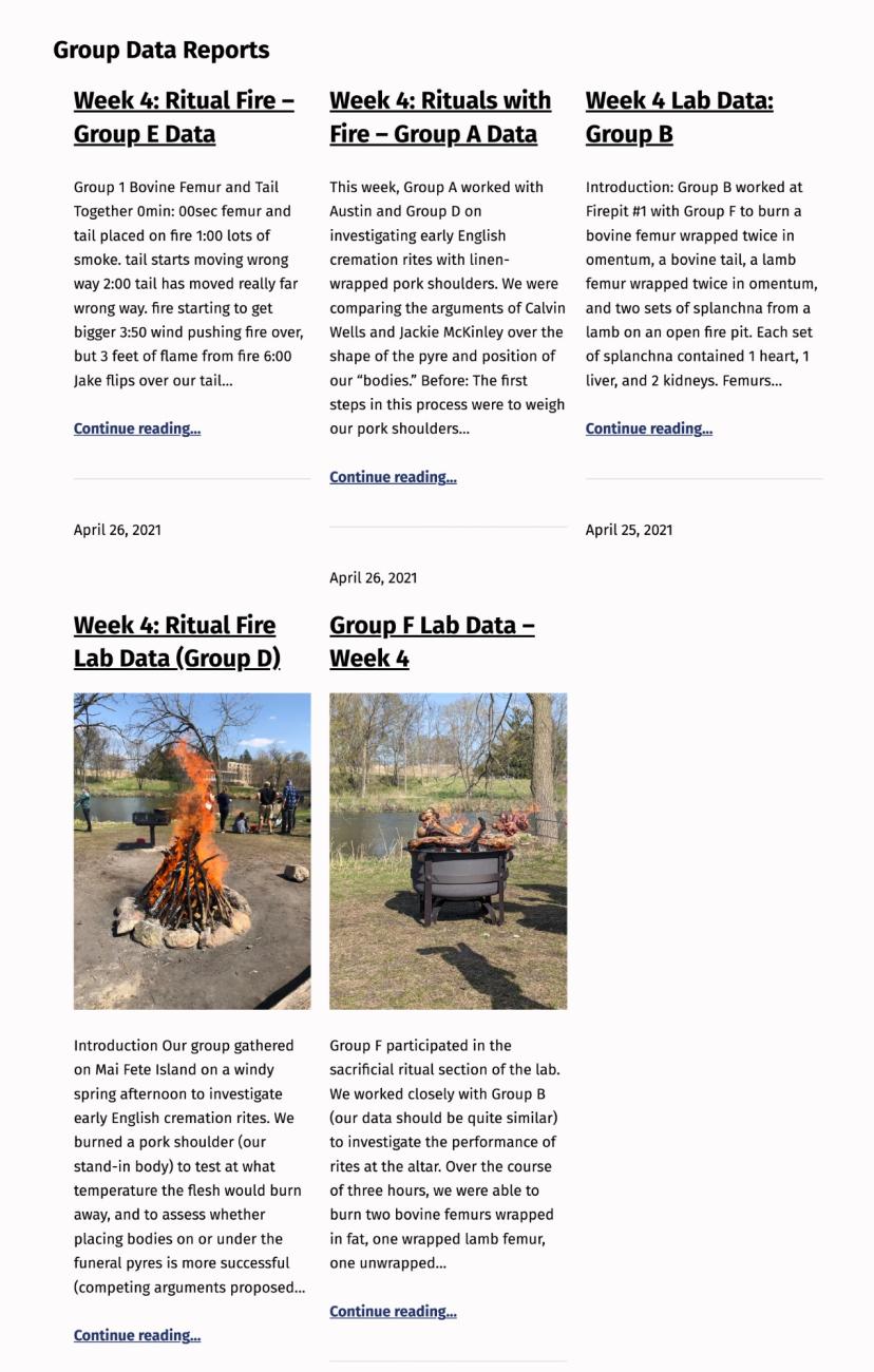 The formal lab summary on our website of the ritual sacrifice experiment from the case study discussed above shows the potential of the classâs pedagogical and technical infrastructure. Morton presented results from this experiment and student photos in a paper entitled The Headless Tables of Pylos Ta 715 at the Archaeological Institute of America Annual Meeting in 2022, and in an article on Greek Bronze Age animal sacrifice which will be published by the American Journal of Archaeology in April 2023. During the same lab that the students were experimenting with Greek animal rituals, Mason had the students conduct a separate set of experiments to test whether the fires that burned bodies in early medieval English cremation cemeteries could have been constructed similarly to those that turned shaped clay into ceramic urns to hold the ashes. The results were affirmative and compelling, and Mason presented them at a conference of the International Society for the Study of Early Medieval England mere weeks after the class ended. The paper - including photos and videos shot by the students - was very well received and has led to the experimentâs inclusion in a forthcoming volume on Cremation in the Early Middle Ages edited by Howard Williams and Femke Lippok (Williams, 2022). The rapid progression from engaged course experience, to successful conference presentation, to forthcoming publication has convinced us that this course structure is both an effective means of engaging students in sympathetic investigations of the lived experience of past peoples and a successful example of how to combine faculty research, undergraduate teaching and digital history at a small liberal arts college.