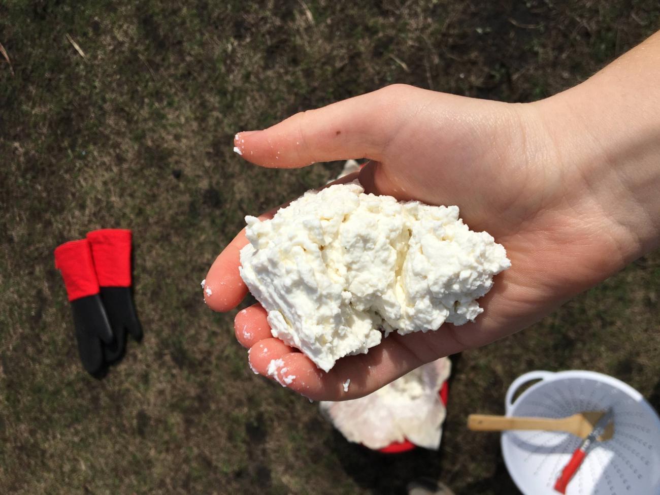 During the course of the Monday and Wednesday classes, we discuss readings on ancient, pre-modern, and modern cheesemaking techniques, as well as further anthropological studies of pre-modern shepherds. In the lab, we move from indoors to an outside area on campus where we have been given permission to hold labs using fire. Students break into three- or four-person lab groups, with two groups per fire pit. Each pit gets a cast iron pot, milk, and rennet. While traditional cheesemakers relied on their years of experience of cheesemaking since childhood to know when all the proper temperatures have been reached and for recognising the different stages of the process, the students have no such experience and instead use detailed lab manuals, thermometers, and timers, and focus on what signals one might learn to observe so that modern devices were not needed. The students bring the milk to a boil, add the rennet (See Figure 4), form the curd, cut the curds (See Figure 5), and strain the curds (See Figure 6). At this point, the students have made the basics from which all Mediterranean traditional cheeses are made (See Figure 7). The students then reserve 5-25% of the curds (different amounts are held back per group) and form the remaining curds into balls and boil them in water to make a âquick mozzarellaâ (See Figure 8). The reserved curds are combined with the whey and boiled, and then strained to make a whey-cheese (such as ricotta).