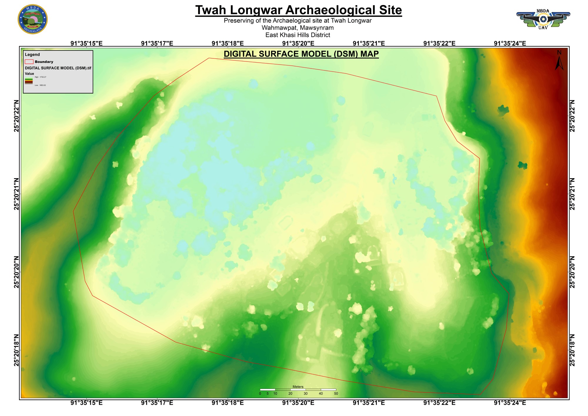 By looking at the Digital Surface Model (DSM) map we can see all the structures that are present on the surface of the site (See Figure 10). The red line indicates the boundary of the site. The structures are also visible on the map. The digital Surface Model captures both natural and man-made structures.