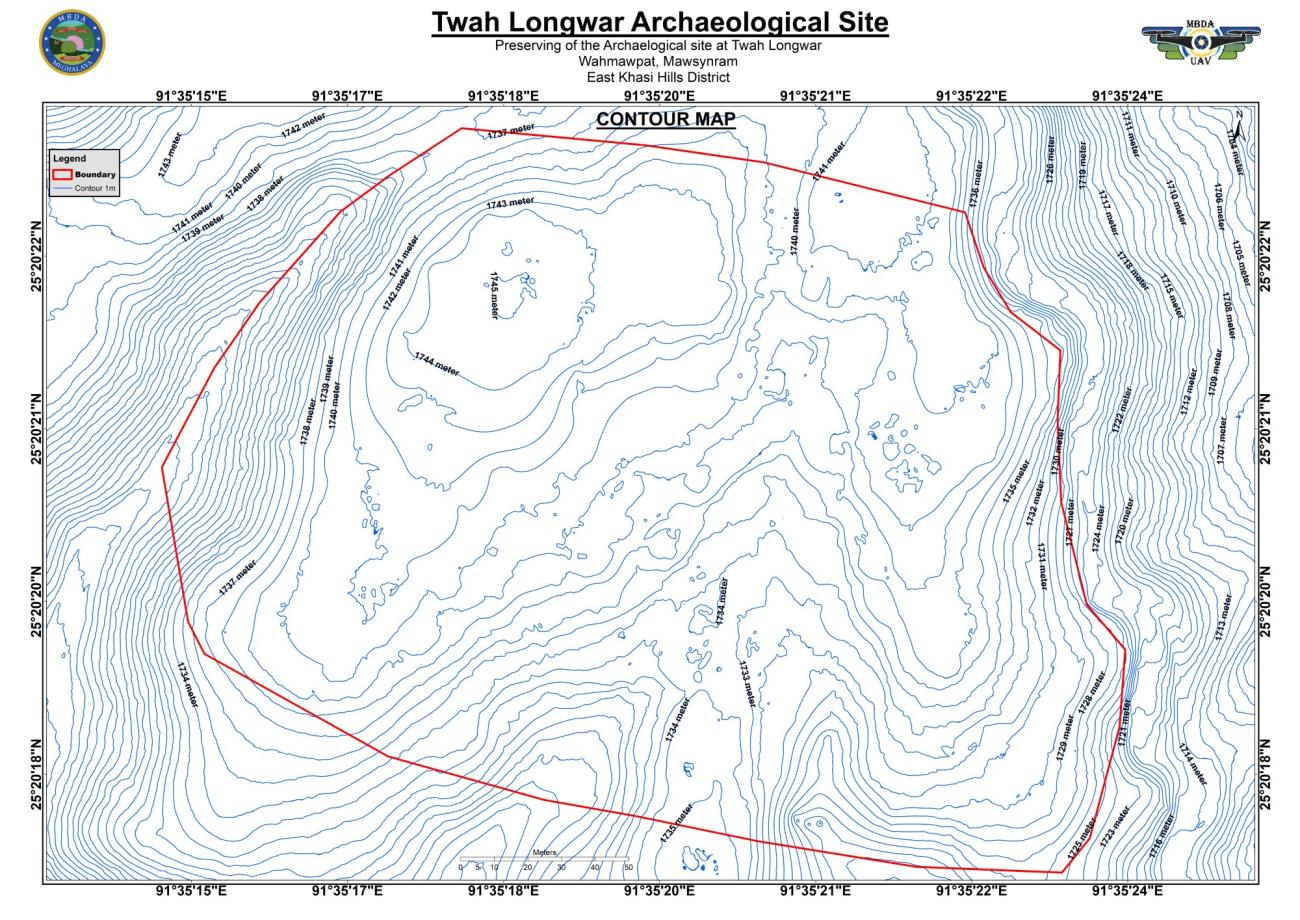 By looking at the Contour map (See Figure 9) we can understand the terrain of the Twah Longwar site. With the help of these contour lines we can see a three-dimension image from a two-dimension image. The contour map helps to understand the lengths, slopes, and width of the hills and valleys of Twah longwar.