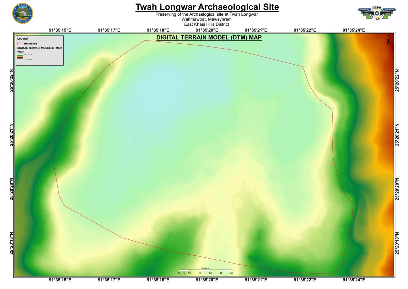 A Digital Terrain Map (DTM) was processed using full-waveform laser scanning (See Figure 11). This provides a three-dimension elevation of the Twah Longwar site but without natural and man-made structures.