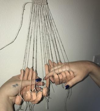 The next method tested the use of these crescents in warp twining. Once again, 20 linen warp threads were attached to the top bar of the loom. This time 10 loom weights were used, with only one thread attached to each perforation. The loom weights were hung side by side across the loom with the odd warp threads attached to the front perforations and the even threads attached to the perforations in the back (See Figure 8). This set up resulted in a tension of around 25-26 g per weight. This method was used to create both a balanced tabby weave and an open netting effect in the same band (See Figure 9). To create the tabby weave with this warp twining method, the crescents were turned 1800 counter-clockwise, one-by-one across the warp after the weft was initially passed through the natural shed. This motion created the counter shed. After the weft was passed through the counter shed, all of the weights were turned clockwise back to their original positions to reform the natural shed and repeat the process. To create the open netting effect, the crescents were always spun 1800 in the same counter-clockwise direction after the weft was passed through, continuously twisting the warp threads around the weft threads (See Figure 10).