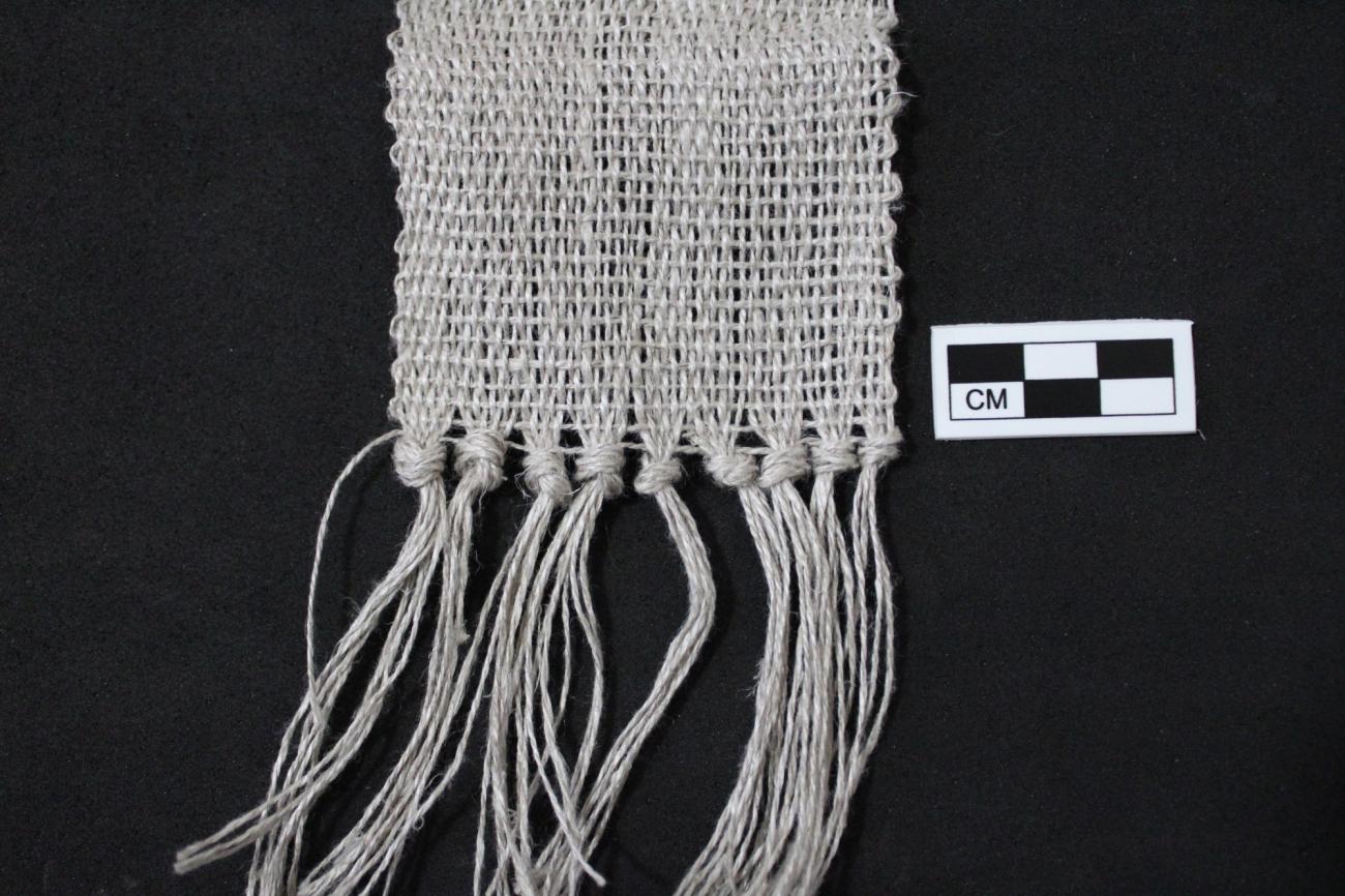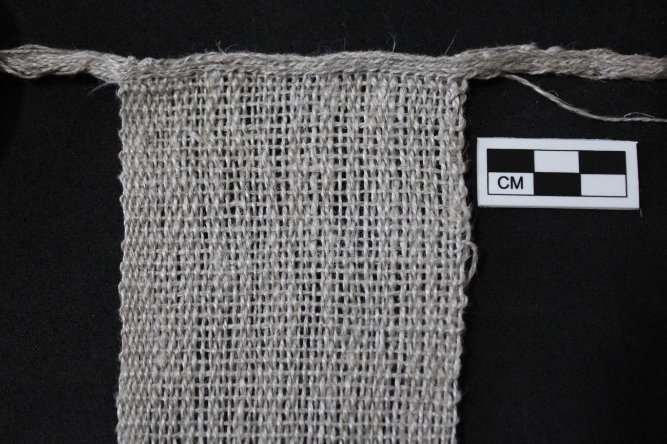 Ancient textile remains in Iberia are rare, particularly in the southwestern region (Alentejo, Algarve, western Andalucia) where crescent loom weights are found. The exceptional textile remains that do survive, which are always fragmented, provide vital information about how textile tools may have functioned and the types of fabrics they may have been used to create. The majority of ancient textile remains from Iberia have been found in south-eastern Spain, as the dry climate in this region provides better preservation conditions. Some of the oldest woven textile fragments from south-eastern Spain date to the Chalcolithic (third millennium BC), with notable remains found in burial contexts at the site Los Millares in Almeria and at Cueva Sagrada in Murcia. The fabrics found at Los Millares, preserved with cremated human remains, are well-balanced tabby weaves, or plain weaves, made from fine linen or hemp fibres (Alfaro Giner, 2012, pp.338-339). A closer look at one of the hemp fragments with a scanning electron microscope revealed a thread count of 11-12 threads/cm made from s-twisted threads, 0.2-0.4 mm thick. The remarkable textiles found at Cueva Sagrada, dated to 2200 BC, consist of two large rectangular linen tunics with a starting border on one end and a series of long fringes at the other made by knotting the bottom of the warp threads together (Alfaro, 1992, pp.22-24). These tunics are balanced tabbies with a thread count of 21/28 threads/cm made of very fine threads, 0.1-0.2 mm thick (Alfaro Giner, 2012, p.339). The tunics are reinforced in some areas with S2z-piled threads that are 0.4 mm thick. In addition to these Chalcolithic finds, around one-hundred Early Bronze Age textile fragments have also been found in south-eastern Spain, primarily from Argaric burial contexts (Basso Rial, Jover Maestre and Lopez, 2021, p.4). A few of these textiles were identified as wool or esparto grass, but the vast majority are linen tabbies made with Z-twisted threads between 0.2-1 mm thick.