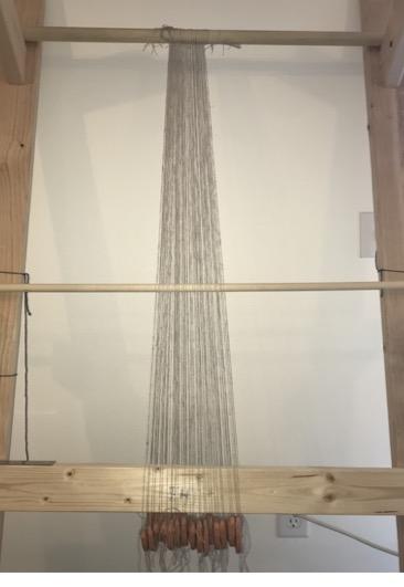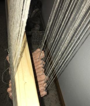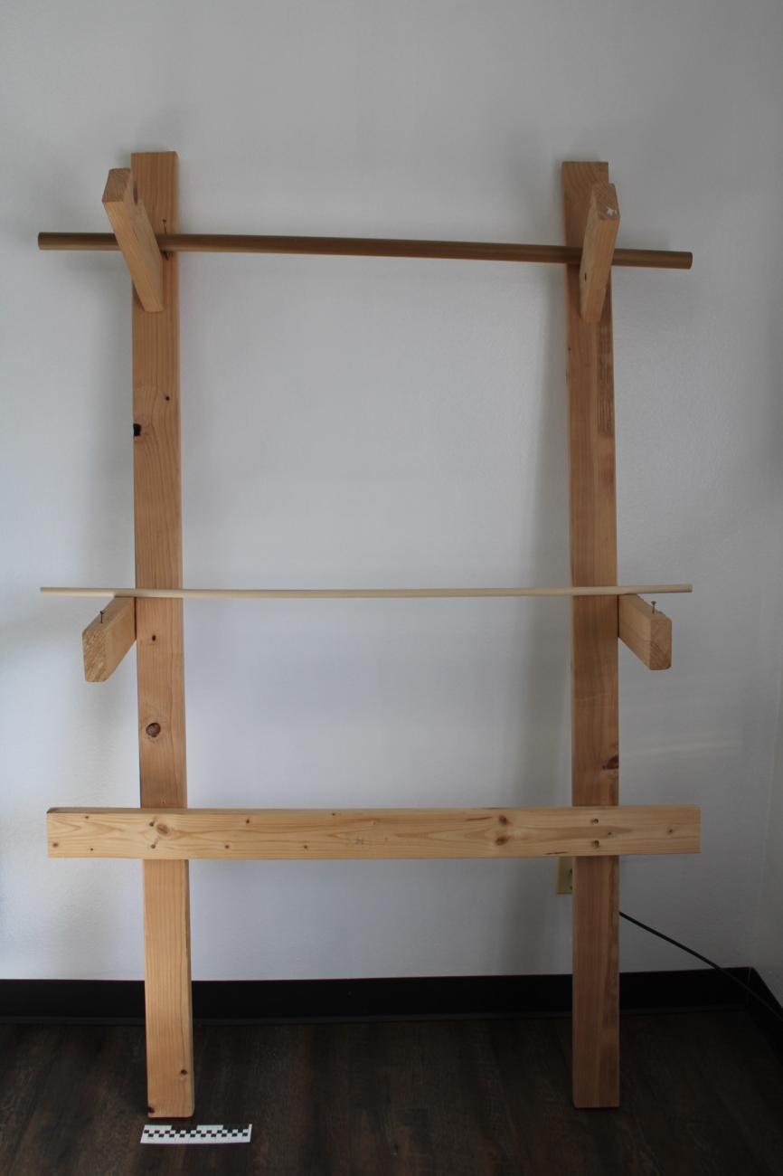 A warp-weighted loom was made to conduct all 3 of these experiments (See Figure 4). No looms or depictions of looms survive from the Late Neolithic or Chalcolithic of Iberia. Loom weights are frequently used to imply the existence of a warp-weighted loom and, as such, it is generally considered to be the earliest archaeologically attested loom in Iberia (Gleba et al., 2021, p.6). This type of loom uses vertical warp threads hanging from a single bar, either upright or leaning slightly against a wall. Rather than try to replicate an ancient construction method, the loom used in these experiments was constructed with modern tools, materials, and dimensional lumber purchased from a local hardware store. This loom was constructed with two main vertical sideboards (38 mm x 89 mm x 182.88 cm) which could lean against the wall at approximately a 70° angle. A board (38 mm x 89 mm x 30.48 cm) was attached perpendicularly to the front face of each of these two main sideboards near the top of the loom at approximately a 30° angle. These attachments were added to mimic a naturally forked tree branch that might have been used in the past to create this style of loom and provide a niche for the top bar of the loom to rest. Another board (38 mm x 89 mm x 30.48 cm) was attached perpendicularly to the outside edges of both of the main vertical sideboards about half-way up to accommodate a horizontal heddle bar when necessary. Finally, a horizontal beam (38 mm x 89 mm x 91.44 cm) was attached across the bottom of the two main vertical sideboards, about 61 cm up from the ground, to provide stability to the frame of the loom and act as a shed bar in the warp weighted weaving experiment. Unattached dowel rods were used for both the top bar of the loom and the heddle bar so that they could be moved, rotated, or removed when necessary, depending on the weaving or twining method being used.